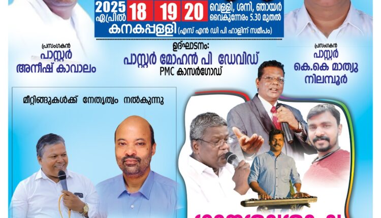 കനകപ്പള്ളി പെന്തക്കോസ്തൽ ടാബർനാക്കിൾ ചർച്ചിന്റെ നേതൃത്വത്തിൽ സിൽവർ ജൂബിലി കൺവെൻഷനും സംഗീത വിരുന്നും ഏപ്രിൽ 18 മുതൽ