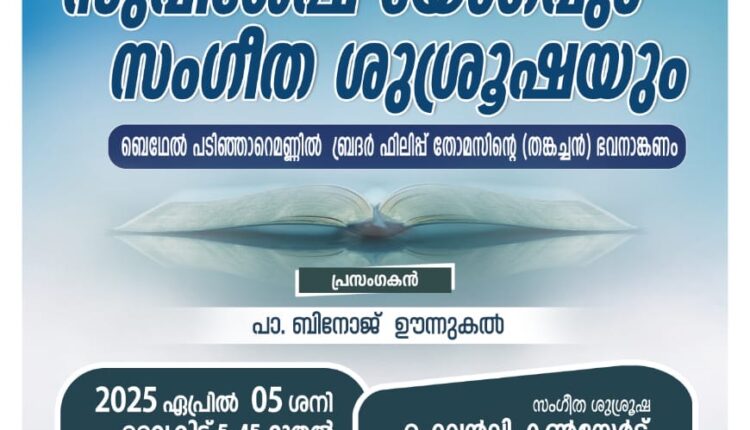 ബെഥേൽ പടിഞ്ഞാറെ മണ്ണിൽ, ബ്രദർ ഫിലിപ്പ് തോമസിന്റെ ഭവനാങ്കണത്തിൽ വെച്ച് 2025 ഏപ്രിൽ 05 തീയതി ശനിയാഴ്ച വൈകിട്ട് 05 : 45 മുതൽ രാത്രി 08 : 30 വരെ നടക്കും. പാസ്റ്റർ മാത്യു വർഗീസ് അധ്യക്ഷത വഹിക്കും. പാസ്റ്റർ ബിനോജ് ഊന്നുകൽ മുഖ്യസന്ദേശം നൽകും പത്തനംതിട്ട, ഹെവൻലി കൺസേർട്ട് സംഗീത ശുശ്രൂഷയ്ക്ക് നേതൃത്വം നൽകും.