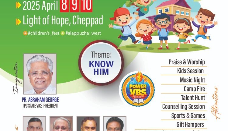 ചേപ്പാട് : ഐപിസി സൺഡേ സ്കൂൾസ് അസോസിയേഷൻ ആലപ്പുഴ വെസ്റ്റ് ഡിസ്ട്രിക്ടിന്റെ നേതൃത്വത്തിൽ ചിൽഡ്രൻസ് ഫെസ്റ്റ് 2025 ഏപ്രിൽ 08,09,10 തീയതികളിലായി ചേപ്പാട് പ്രത്യാശാ ദീപം ക്യാമ്പ് സെന്ററിൽ നടത്തപെടും. നാളെ രാവിലെ 8.15 ന് രജിസ്ട്രേഷൻ ആരംഭിക്കും. 9.30 ന് ഐ പി സി കേരള സ്റ്റേറ്റ് വൈസ് പ്രസിഡന്റ് പാസ്റ്റർ എബ്രഹാം ജോർജ്, ക്യാമ്പ് ഉത്ഘാടനം ചെയ്യും.