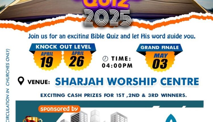 പി. വൈ. പി. എ. യു. ഇ. റീജിയന്റെ നേതൃത്വത്തിൽ ക്രമീകരിച്ചിരിക്കുന്ന മെഗാ ബൈബിൾ ക്വിസ് “ബറകാ” ഏപ്രിൽ 19, 26 തീയതികളിലും മെയ് 3-ന് ഷാർജ വാർഷിപ് സെന്ററിൽ നടത്തപ്പെടുന്നു.