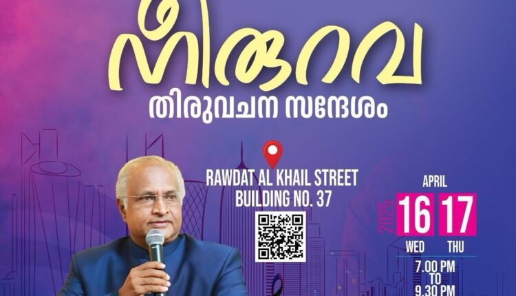 ഖത്തർ: ലിവിങ് വാട്ടർ ചർച്ച് ഓഫ് ഗോഡ്, ദോഹ സഭ ഒരുക്കുന്ന രണ്ടു ദിവസത്തെ കൺവൻഷൻ നീരുറവ ഏപ്രിൽ 16,17 തീയതികളിൽ നടത്തപ്പെടും. പ്രസ്തുത യോഗങ്ങളിൽ കർത്താവിൽ ബഹുമാന്യനായ പാസ്റ്റർ റ്റി.ഡി ബാബു തിരുവചന സന്ദേശം അറിയിക്കുകയും ലിവിങ് വാട്ടർ ക്വയർ സംഗീത ശുശ്രുഷയും നിർവ്വഹിക്കും. ഖത്തറിലുള്ള എല്ലാ ദൈവദാസന്മാരെയും, വിശ്വാസസമൂഹത്തെയും ഈ യോഗങ്ങളിലേക്ക് ഹാർദ്ധവമായി ക്ഷണിച്ചുകൊള്ളുന്നുവെന്ന് സഭാ നേതൃത്വം അറിയിച്ചുകൊള്ളുന്നു.
