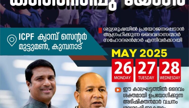 മാരാമൺ: ചർച്ച് ഓഫ് ഗോഡ്, കേരള സ്റ്റേറ്റ്, പ്രയർ ബോർഡിന്റെ ആഭിമുഖ്യത്തിൽ 3 ദിവസത്തെ “കാത്തിരിപ്പു യോഗം” സംഘടിപ്പിക്കുന്നു. മെയ് 26 മുതൽ 28 വരെ മുട്ടുമൺ ഐസിപിഎഫ് ക്യാമ്പ് സെൻ്ററിൽ വച്ച് നടക്കും. സ്റ്റേറ്റ് ഓവർസിയർ പാസ്റ്റർ വൈ റെജി ഉൽഘാടനം നിർവ്വഹിക്കും. പ്രശസ്തരായ ഉണർവ്വ് പ്രഭാഷകർ ആത്മീക ശുശ്രൂഷകൾക്ക് നേതൃത്വം നൽകും. അനുഗൃഹീതരായ ഗായകർ ഗാനശുശ്രൂഷ നയിക്കും.