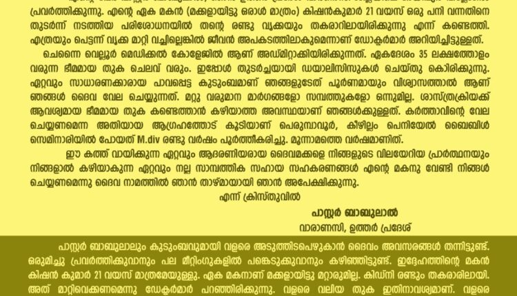 ഉത്തര് പ്രദേശ്: വാരണാസി ജില്ലയിലെ ദേയിപുര് വില്ലേജില് പ്രവര്ത്തിക്കുന്ന പാസ്റ്റർ ബാബുലാന്റെ ഏക മകന് (മക്കളായിട്ടു ഒരാൾ മാത്രം) കിഷന്കുമാര് 21 വയസ് ഒരു പനി വന്നതിനെ തുടര്ന്ന് നടത്തിയ പരിശോധനയിൽ തന്റെ രണ്ടു വൃക്കയും തകരാറിലായിരിക്കുന്നു എന്ന് കണ്ടെത്തി. എത്രയും പെട്ടന്ന് വൃക്ക മാറ്റി വച്ചില്ലെങ്കിൽ ജീവൻ അപകടത്തിലാകുമെന്നാണ് ഡോക്ടർമാർ അറിയിച്ചിട്ടുള്ളത്.