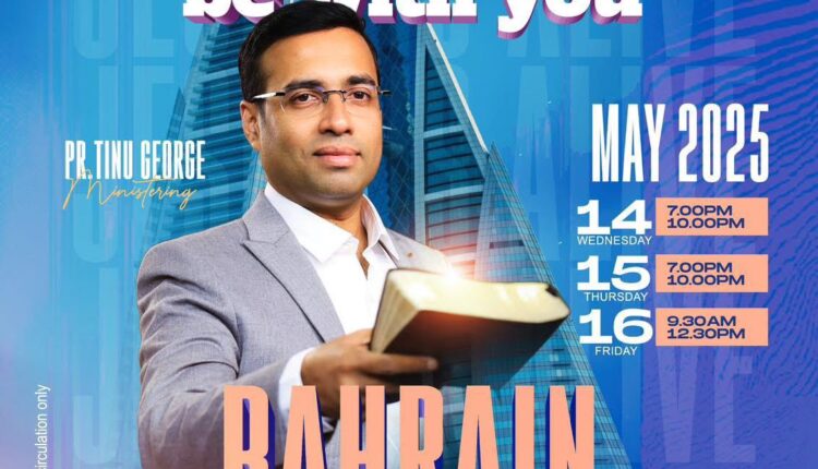 ബഹറിൻ : എൽ ഷദായി ബഹറിൻ ചർച്ചിന്റെ ആഭിമുഖ്യത്തിൽ മെയ് 14,15,16 തീയതികളിൽ വൈകിട്ട് 7. 30 മുതൽ ”Peace be with you” കൺവെൻഷൻ ഐപിസി ബഹറിൻ ചർച്ച് ഹാളിൽ വെച്ച് നടത്തപ്പെടുന്നു. പാസ്റ്റർ ടിനു ജോർജ് ദൈവവചനത്തിൽ നിന്നും സംസാരിക്കും.