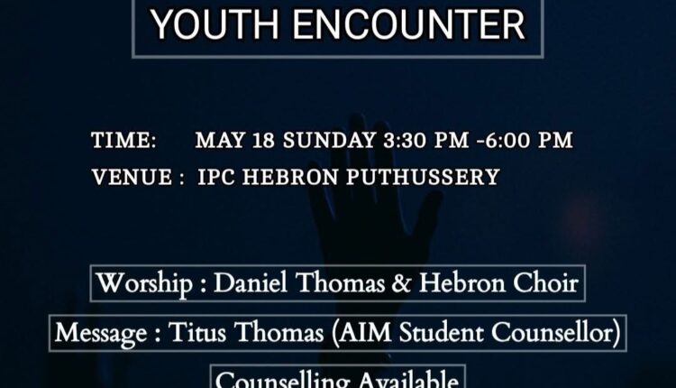 പുതുശേരി: പെന്തെക്കോസ്തൽ യൂത്ത് ഫെല്ലോഷിപ്പിന്റെ നേതൃത്വത്തിൽ മെയ് 18 ന് യുവജന സമ്മേളനവും കൗൺസിലിങ്ങും പുതുശേരി ഐപിസി ഹെബ്രോൻ സഭയിൽ നടക്കും. ഉച്ചയ്ക്ക് 3:30 യ്ക്ക് ആരംഭിക്കുന്ന യോഗത്തിൽ ടൈറ്റസ് തോമസ് ക്ലാസ്സുകൾ നയിക്കും. ഡാനിയേൽ തോമസും ഹെബ്രോൻ ക്വയറും ഗാനശുശ്രുഷയ്ക്ക് നേതൃത്വം നൽകും.
