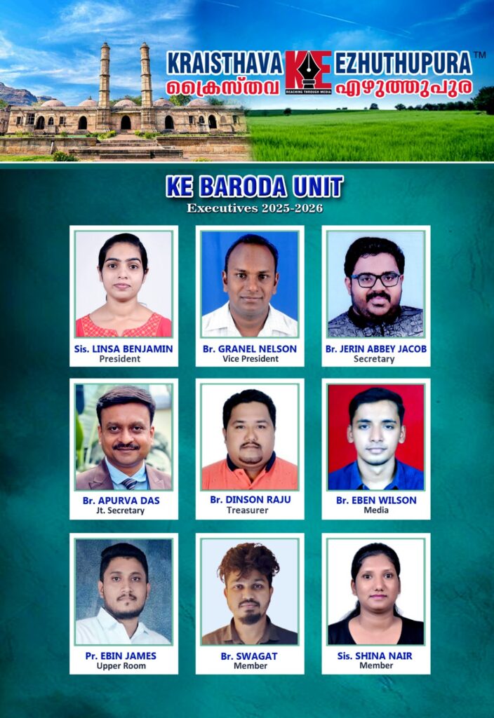 വഡോദര / ഗുജറാത്ത് : ക്രൈസ്തവ എഴുത്തുപുര ബറോഡാ യൂണിറ്റിന് പുതിയ നേതൃത്വത്തെ തിരഞ്ഞെടുത്തു. പ്രസിഡന്റ് സിസ്റ്റർ ലിൻസ ബെഞ്ചമിൻ, വൈസ് പ്രസിഡന്റ് ബ്രദർ ഗ്രനൽ നെൽസൺ,