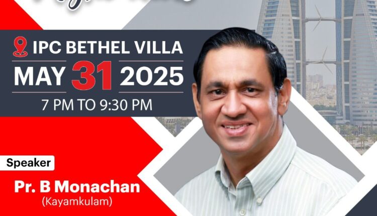 മനാമ: പി. വൈ.പി. എ ബഹറിൻ റീജിയൻ ഒരുക്കുന്ന ഗോസ്പെൽ നൈറ്റ് 2025 മെയ് 31 തിയതി വൈകിട്ടു ഏഴു മണി മുതൽ ഒൻപതു മുപ്പതു വരെ ഐ പി സി ബെഥേൽ വില്ലയിൽ വെച്ചു നടത്തപ്പെടുന്നു പ്രസ്തുത മീറ്റിംഗിൽ കർത്തു ദാസൻ പാസ്റ്റർ ബി മോനച്ചൻ വചന ശുശ്രുഷിക്കുന്നു പി.വൈ. പി എ. ബഹറിൻ റീജിയൻ ആരാധനയ്ക്കു നേത്ര്ത്വം നൽകും