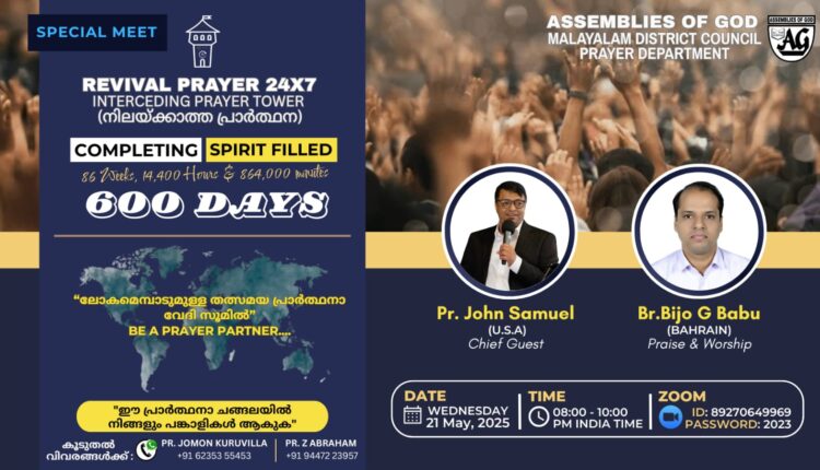 എ.ജി. റിവൈവൽ പ്രയറായ നിലയ്ക്കാത്ത പ്രാർത്ഥന തുടർച്ചയായ അറുനൂറാമത് ദിവസം പിന്നിടുന്നു.