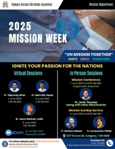 കാൽഗറി, കാനഡ: കാൽഗരിയിലെ പ്രഥമ മലയാളം പെന്തകൊസ്തു സഭയായ കാൽഗറി കേരള ക്രിസ്ത്യൻ അസംബ്ലിയുടെ മിഷൻ ഡിപ്പാർട്മെന്റിന്റെ ആഭിമുഖ്യത്തിൽ ഏകദിന മിഷൻ കോൺഫറൻസ് ജൂൺ 7, 2025 ശനിയാഴ്ച്ച പകൽ 10:00 AM മുതൽ നടത്തപ്പെടുന്നു.