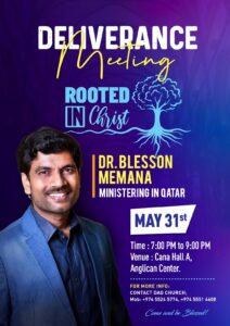 ദോഹ :ദോഹ അസംബ്ളീസ് ഓഫ് ഗോസ് സഭയുടെ ആഭിമുഖ്യത്തിൽ മെയ് 29 വൈകിട്ട് 7മണിയ്യ്ക്ക് ആരംഭിച്ച വിടുതലിൻ ആരാധനയുടെ സമാപന സമ്മേളനം ഇന്ന്