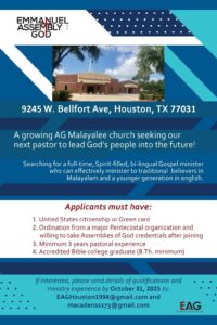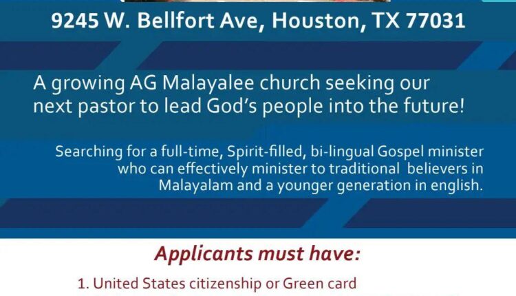 ADVT ഹൂസ്റ്റണിലെ ഇമ്മാനുവേൽ ഏജി സഭയിലേക്ക് സഭാശുശ്രൂഷകനെ ആവശ്യമുണ്ട് On Jun 2, 2025 611 Share to WhatsApp - Advertisement - 611 Share WhatsAppFacebookTwitterGoogle+EmailPrintFacebook MessengerTelegram