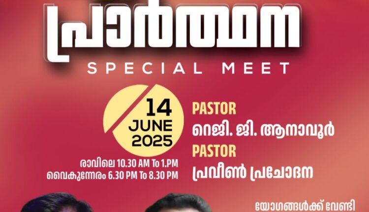 പാലക്കാട് : വാൽക്കുളമ്പ് ശാരോൻ ഫെല്ലോഷിപ്പ് ചർച്ചിന്റെ ആഭിമുഖ്യത്തിൽ ജൂൺ 14 ന് ഏകദിന പ്രാർത്ഥന നടക്കും. രാവിലെ 10.30നും രാത്രി യോഗം 6.30 നും നടക്കുന്ന യോഗത്തിൽ പാസ്റ്റർമാരായ റെജി ജി ആനാവൂരും, പ്രവീൺ പ്രചോദനയും പ്രസംഗിക്കും.