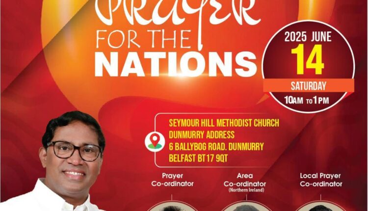 ഇംഗ്ലണ്ട്: മലയാളി പെന്തെക്കൊസ്ത് അസോസിയേഷൻ യു.കെയുടെ ആഭിമുഖ്യത്തിൽ രാജ്യത്തിന്റെ ഉണർവ്വിനായി ഇംഗ്ലണ്ടിലെ വിവിധ പട്ടണങ്ങളിൽ വെച്ച് നടക്കുന്ന ഏകദിന പ്രാർത്ഥനാ സംഗമം ജൂൺ 14 ശനിയാഴ്ച രാവിലെ 10 മുതൽ ഉച്ചക്ക് 1 മണി വരെ ബെൽഫാസ്റ്റ് ഐ.പി.സി സഭയിൽ വെച്ച് നടക്കും. പ്രസിഡണ്ട് പാസ്റ്റർ ജെയിംസ് സാമുവേൽ ഉദ്ഘാടനം ചെയ്യും. പ്രയർ കോർഡിനേറ്റർ പാസ്റ്റർ ജോൺസൺ ജോർജ്ജ് നേതൃത്വം നൽകും. ഏരിയ കോർഡിനേറ്റർ ബ്രദർ തോമസ് മാത്യു, ലോക്കൽ കോർഡിനേറ്റർ പാസ്റ്റർ ജേക്കബ് ജോൺ എന്നിവർ മീറ്റിംഗിന്റെ ക്രമീകരണങ്ങൾ നിർവ്വഹിക്കും.