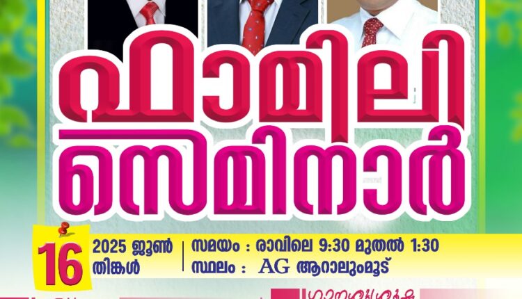 തിരുവനന്തപുരം: അസംബ്ലീസ് ഓഫ് ദക്ഷിണ മേഖല ഫാമിലി സെമിനാർ 2025 ജൂൺ 16 തിങ്കളാഴ്ച രാവിലെ 9.30 മുതൽ ഉച്ചയ്ക്ക് 1.30 വരെ എ. ജി. ആറാലുംമൂട് ചർച്ചിൽ വെച്ച് നടക്കും. സീനിയർ ശുശ്രൂഷകൻ പാസ്റ്റർ ഡി. ജയരാജ് ഉദ്ഘാടനം ചെയ്യും. ദക്ഷിണ മേഖല ഡയറക്ടർ പാസ്റ്റർ സനൽ കുമാർ ആർ. അദ്ധ്യക്ഷത വഹിക്കും. ഡിസ്ട്രിക്ട് അസിസ്റ്റന്റ് സൂപ്രണ്ട് ഡോ. ഐസക് വി. മാത്യുവും പാസ്റ്റർ ക്രിസ്റ്റഫർ തുരുത്തിയും പ്രസംഗിക്കും. ബ്രദർ ബോവസ്, സിസ്റ്റർ ജൂഡിറ്റ ജോൺ, സിസ്റ്റർ സ്റ്റെഫിയ ജോർജ്ജ്, ബ്രദർ ഫെയ്ത്ത് എബ്രഹാം എന്നിവർ ഗാനശുശ്രൂഷയ്ക്ക് നേതൃത്വം നൽകും. ക്രമീകരണങ്ങൾക്ക് പാസ്റ്റർ ബെന്നിയും ആറാലുംമൂട് സഭയും നേതൃത്വം നൽകും.