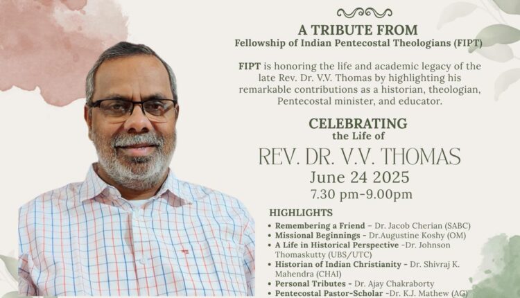 നിത്യതയിൽ ചേർക്കപ്പെട്ട ക്രിസ്തീയ ചരിത്രകാരനും ദൈവശാസ്ത്രജ്ഞനും, പെന്തക്കോസ്ത് വേദ അധ്യാപകനുമായിരുന്ന റവ. ഡോ. വി.വി. തോമസിന്റെ ശ്രദ്ധേയമായ സംഭാവനകൾ പരിഗണിച്ചു ഫെല്ലോഷിപ് ഓഫ് ഇന്ത്യൻ പെന്തകോസ്ത് തിയോളജിയൻസിന്റെ (FIPT) നേതൃത്വത്തിൽ ഡോ. വി വി തോമസിന്റെ ജീവിതത്തെയും അക്കാദമിക് പൈതൃകത്തെയും ആദരിക്കുന്ന അനുസ്മരണ സമ്മേളനം ജൂൺ 24ന് വൈകുന്നേരം 07.30 മണി മുതൽ 09.00 മണി വരെ സൂം ഓൺലൈൻ പ്ലാറ്റ്ഫോമിൽ നടക്കും. ഡോ. വി വി തോമസുമായി ചേർന്ന് പ്രവർത്തിച്ച ഇന്ത്യൻ ദൈവശാസ്ത്രമേഖലയിൽ നിന്നുള്ള അധ്യാപകരും ശുശ്രുഷകരും അദ്ദേഹത്തെ കുറിച്ചുള്ള ഓർമ്മകൾ പങ്ക് വെക്കും. FIPT അനുസ്മരണ സമ്മേളനത്തിന് നേതൃത്വം നൽകും.