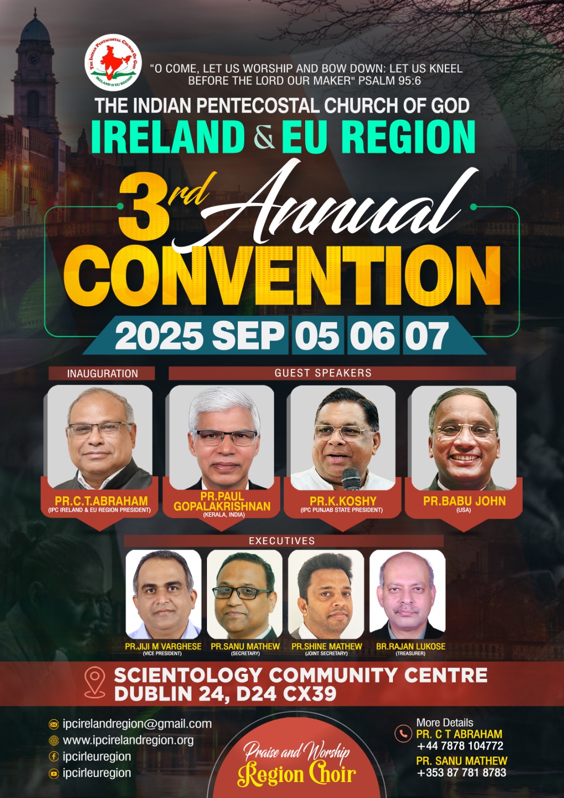 അയർലൻഡ്: യൂറോപ്പ്യൻ ഭൂഖണ്ഡത്തിലെ തെക്കു പടിഞ്ഞാറൻ ദ്വീപായ അയർലണ്ടിലെ ഏറ്റവുും വലിയ പെന്തക്കോസ്ത് പ്രസ്ഥാനം ആയ ഐ പി സി അയർലൻഡ് & ഇ യൂ റീജിയന്റെ മൂന്നാമത് വാർഷിക കൺവെൻഷൻ സെപ്റ്റംബർ 5 മുതൽ 7 വരെ ഡബ്ലിനിലെ സയന്റോളജി കമ്മ്യൂണിറ്റി സെന്ററിൽ വെച്ച് നടത്തപ്പെടുന്നു. 5 ന് വൈകിട്ട് 6.30ന് ഐപിസി അയർലൻഡ് & ഇ യു റീജിയൻ പ്രസിഡന്റ് പാസ്റ്റർ സി.റ്റി എബ്രഹാം മൂന്നാമത് വാർഷിക കൺവെൻഷൻ ഉദ്ഘാടനം ചെയ്യും. പാസ്റ്റർ പോൾ ഗോപാലകൃഷ്ണൻ (കൊച്ചറ) മുഖ്യ പ്രഭാഷകൻ ആയിരിക്കും. കൂടാതെ പാസ്റ്റർ കെ കോശി (ഐപിസി പഞ്ചാബ് സ്റ്റേറ്റ് പ്രസിഡന്റ് ) പാസ്റ്റർ ബാബു ജോൺ (യു.എസ്.എ) വിവിധ സെഷനുകളിൽ ദൈവ വചനം സംസാരിക്കും.