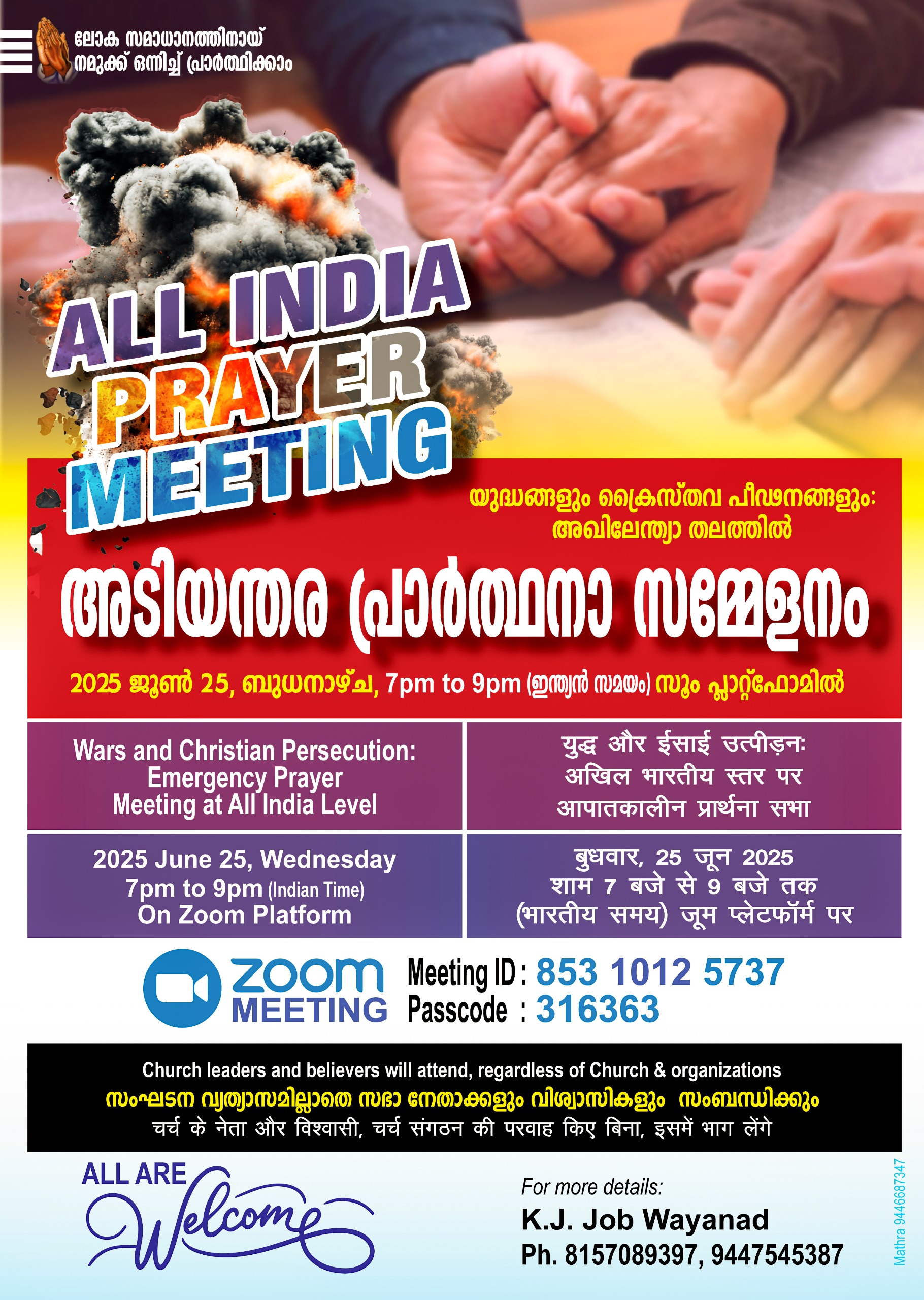 ന്യൂഡൽഹി: വർദ്ധിച്ചു വരുന്ന യുദ്ധ സഹചര്യങ്ങളും ക്രൈസ്തവ പീഢനങ്ങളും-അഖിലേന്ത്യാ തലത്തിൽ അടിയന്തര പ്രാർത്ഥനാ സമ്മേളനം ജൂൺ 25 ന് സൂം ഇന്ത്യൻ സമയം വൈകിട്ട് 7 മുതൽ 9 വരെ പ്ലാറ്റ്ഫോമിൽ നടക്കുന്നു. സഭാ സംഘടന വ്യത്യാസമില്ലാതെ സഭാ നേതാക്കളും വിശ്വാസികളും സംബന്ധിക്കും.യുദ്ധവും മരണങ്ങളും നടക്കുന്ന രാജ്യങ്ങൾക്കു വേണ്ടിയും ക്രിസ്തുവിശ്വാസത്തിനുവേണ്ടി രക്തസാക്ഷികൾ ആയ വ്യക്തികൾ താമസിക്കുന്ന രാജ്യങ്ങൾക്ക് വേണ്ടിയും