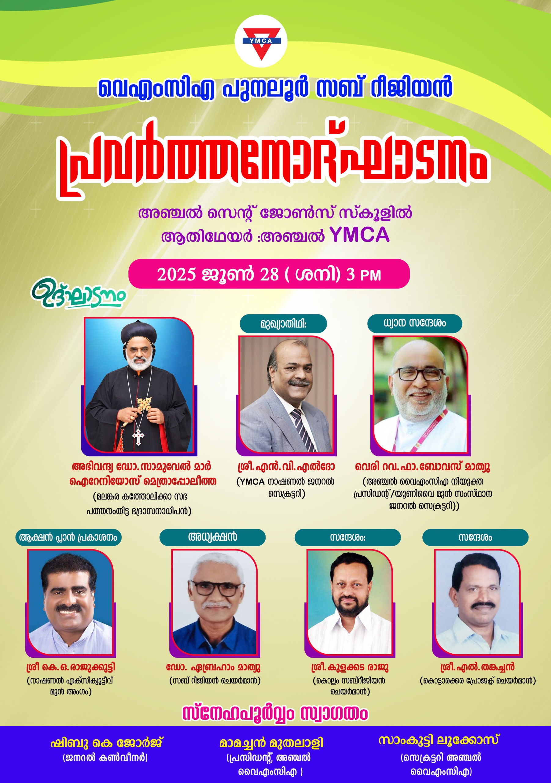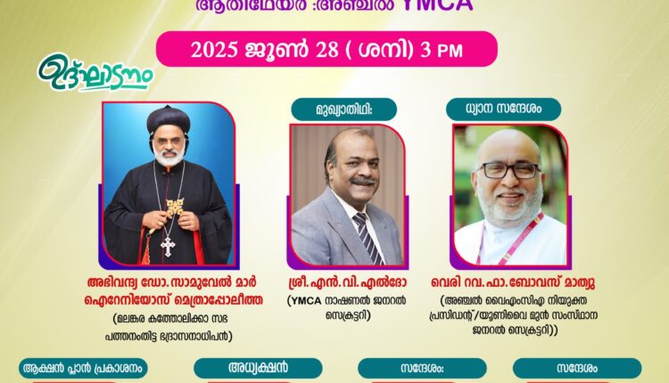 അധ്യക്ഷത വഹിക്കും.ആക്ഷൻ പ്ലാൻ പ്രകാശനം നാഷണൽ എക്സിക്യൂട്ടീവ് മുൻ അംഗം കെ.ഒ.രാജുക്കുട്ടി നിർവഹിക്കും. കൊല്ലം സബ് റീജിയൻ ചെയർമാൻ കുളക്കട രാജു,എക്യുമെനിക്കൽ സെന്റർ ചെയർമാൻ എൽ.തങ്കച്ചൻ,അഞ്ചൽ വൈഎംസിഎ പ്രസിഡന്റ് മാമച്ചൻ മുതലാളി,ജനറൽ കൺവീനർ ഷിബു.കെ. ജോർജ്,വൈസ് ചെയർമാൻ ബിനു.കെ. ജോൺ, അഞ്ചൽ വൈഎംസിഎ സെക്രട്ടറി സാംകുട്ടി ലൂക്കോസ് എന്നിവർ പ്രസംഗിക്കും.സ്തോത്ര ശുശ്രൂഷകൾക്ക് മുൻ സബ് റീജിയൻ ചെയർമാൻമാർ നേതൃത്വം നൽകും.