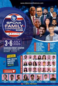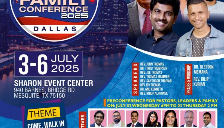 ഡാളസ്, ടെക്സാസ്: ശാരോൻ ഫെല്ലോഷിപ്പ് ചർച്ചസ് ഓഫ് നോർത്ത് അമേരിക്ക (SFCNA) 19മത് ഫാമിലി കോൺഫറൻസ് 2025 ജൂലൈ 3 മുതൽ 6 വരെ ഡാളസിലെ ശാരോൻ ഇവന്റ് സെന്ററിൽ (940 ബാർണസ് ബ്രിഡ്ജ് റോഡ്, മെസ്ക്വൈറ്റ്, TX 75150) നടക്കും.