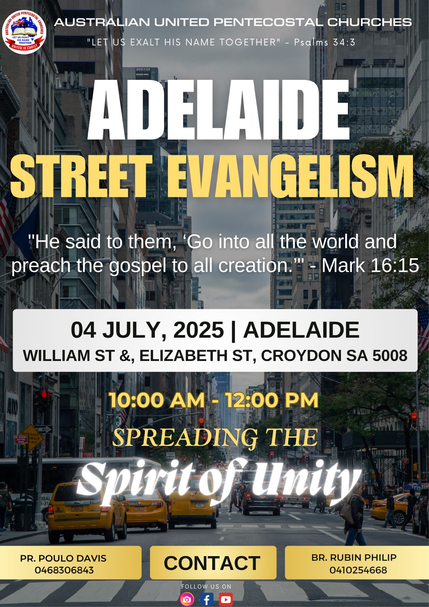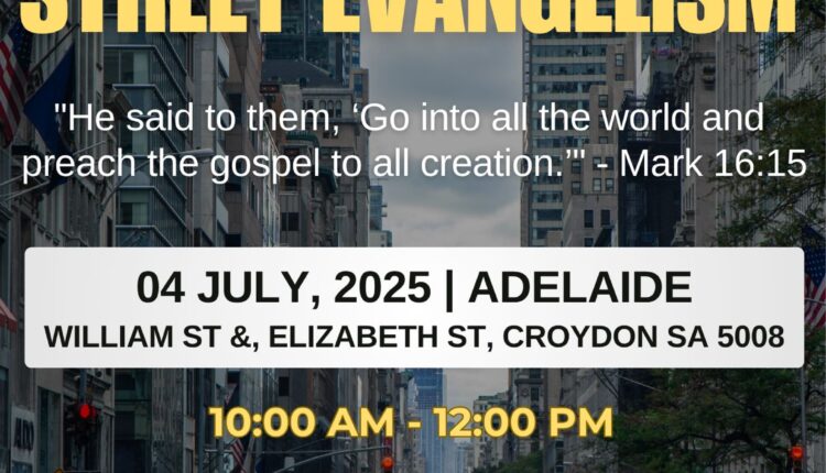AUPC is conducting a powerful time of street evangelism on Friday, 4th July 2025, as we take the life-changing message of the Gospel into the streets of Croydon, South Australia. The event will be held at the corner of William Street and Elizabeth Street, Croydon SA 5008, from 10:00 AM to 12:00 PM.