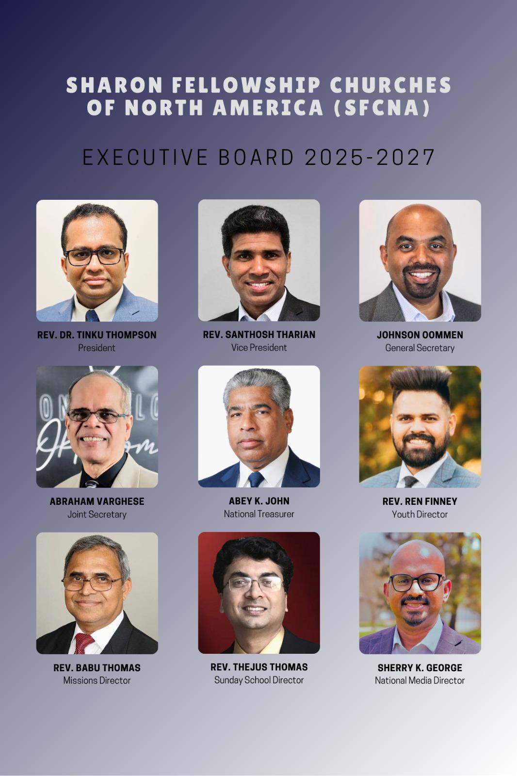 നോർത്ത് അമേരിക്ക: ശാരോൺ ഫെലോഷിപ്പ് ചർച്സ് ഓഫ് നോർത്ത് അമേരിക്കയുടെ ( എസ്.എഫ്.സി.എൻ.എ) ദേശീയ എക്സിക്യൂട്ടീവ് നേതൃത്വം തുടരും 2025–2027 വരെയാണ് കാലാവധി. എസ്.എഫ്.സി.എൻ.എ 2025 ഫാമിലി കോൺഫറൻസിൽ നടന്ന ജനറൽ ബോഡി മീറ്റിംഗിലാണ് ഈ തീരുമാനംഎടുത്തത്. എസ്.എഫ്.സി.എൻ.എ. സമൂഹത്തെ ശക്തിപ്പെടുത്തുന്നതിൽ ഈ ടീം നിർണായക പങ്ക് വഹിച്ചിട്ടുണ്ട്, അവരുടെ തുടർച്ചയായ നേതൃത്വം ആത്മീയ ദർശനം, ഐക്യം, മികവ് എന്നിവയോടെ സഭയുടെ ദൗത്യം കൂടുതൽ മുന്നോട്ട് കൊണ്ടുപോകും. എസ്.എഫ്.സി.എൻ.എ. ദേശീയ എക്സിക്യൂട്ടീവ് കമ്മിറ്റി അംഗങ്ങളായി പ്രസിഡന്റ്: പാസ്റ്റർ ഡോ. ടിങ്കു തോംസൺ, വൈസ് പ്രസിഡന്റ്: പാസ്റ്റർ സന്തോഷ് തര്യൻ, ജനറൽ സെക്രട്ടറി: ജോൺസൺ ഉമ്മൻ, ജോയിന്റ് സെക്രട്ടറി: എബ്രഹാം വർഗീസ്, ട്രഷറർ: എബി കെ. ജോൺ, മിഷൻസ് ഡയറക്ടർ: പാസ്റ്റർ ബാബു തോമസ്, യൂത്ത് ഡയറക്ടർ: പാസ്റ്റർ റെൻ ഫിന്നി, സൺഡേ സ്കൂൾ ഡയറക്ടർ: പാസ്റ്റർ തേജസ് തോമസ്, മീഡിയ ഡയറക്ടർ: ഷെറി കെ. ജോർജ് എന്നിവർ വീണ്ടും തിരഞ്ഞെടുക്കപ്പെട്ടു.