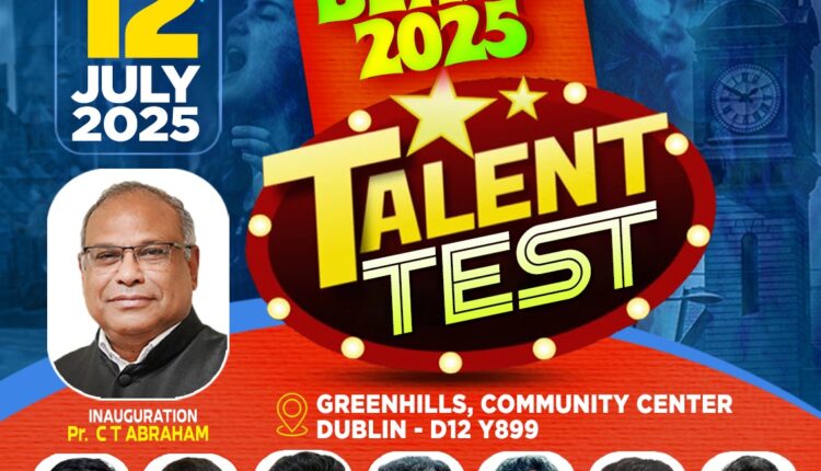 ഡബ്ലിൻ : ഐപിസി അയർലൻഡ് & ഇ യു റീജിയന്റെ പി വൈ പി എ ടാലന്റ് ടെസ്റ്റ് ജൂലൈ 12 ന് ഡബ്ലിനിലെ ഗ്രീൻഹിൽസ് കമ്മ്യൂണിറ്റി സെന്ററിൽ വച്ചു നടക്കും. ഐപിസി അയർലൻഡ് & ഇ യു റീജിയൻ പ്രസിഡന്റ് പാസ്റ്റർ സി റ്റി എബ്രഹാം ഉദ്ഘാടനം നിർവഹിക്കും.