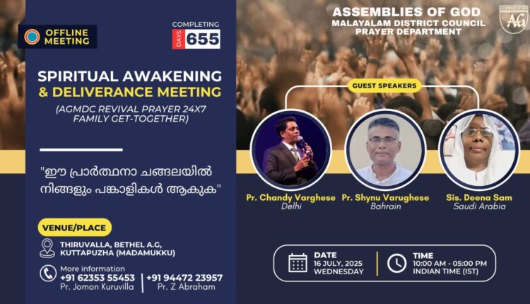തിരുവല്ല : അസംബ്ലീസ് ഓഫ് ഗോഡ് മലയാളം ഡിസ്ട്രിക്ട് പ്രയർ ഡിപ്പാർട്ട്മെൻ്റിൻ്റെ ആഭിമുഖ്യത്തിൽ തിരുവല്ലയിൽ ഏകദിന ഉണർവ് യോഗവും