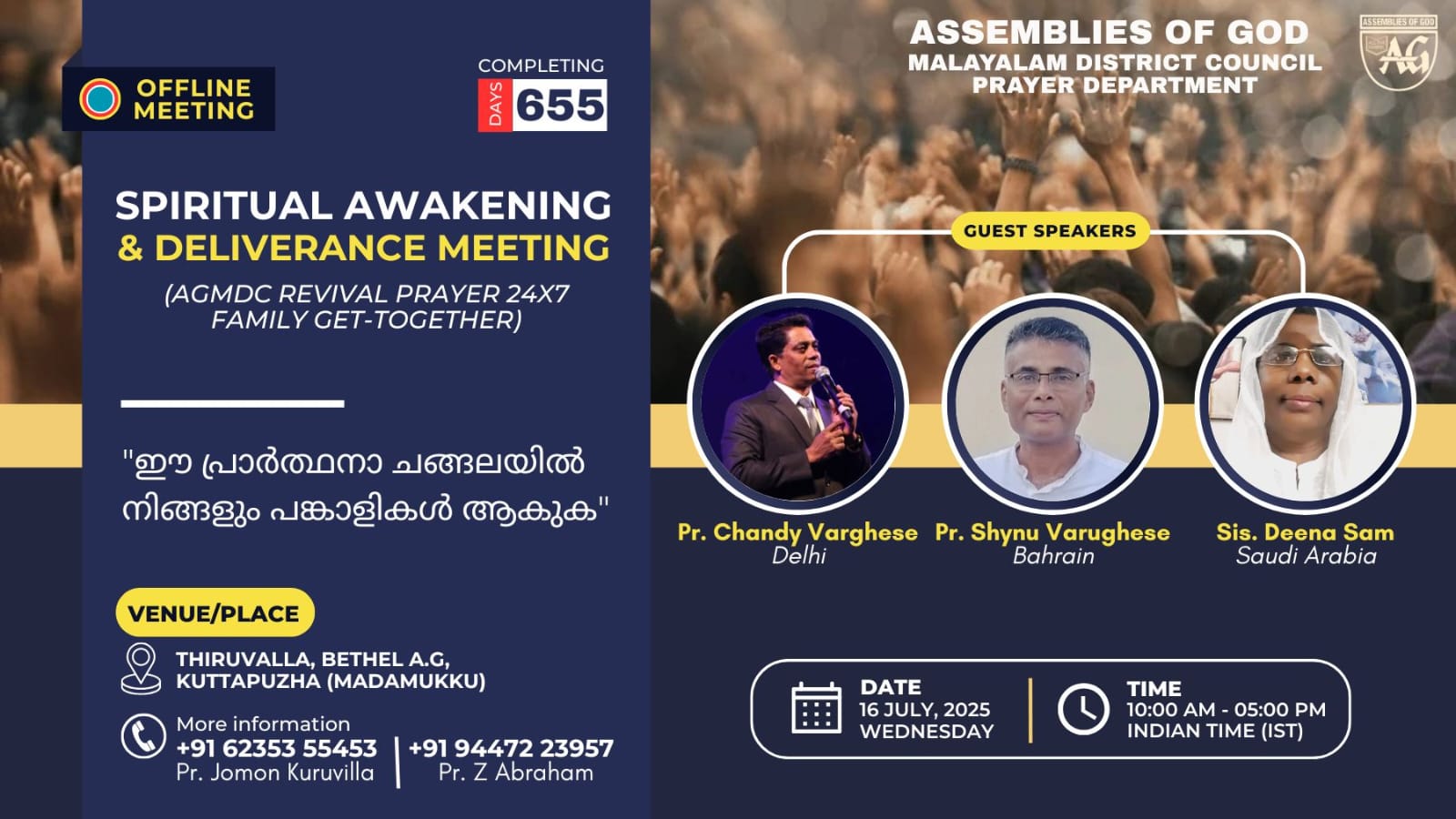 ശുശ്രുഷകൾക്ക് അസംബ്ലീസ് ഓഫ് ഗോഡ് മലയാളം ഡിസ്ട്രിക്ട് പ്രയർ ഡിപ്പാർട്ട്മെൻ്റ് ഭാരവാഹികളായ പാസ്റ്റേഴ്സ് ജോമോൻ കുരുവിള (ചെയർമാൻ),ഡി.കുമാർ ദാസ്