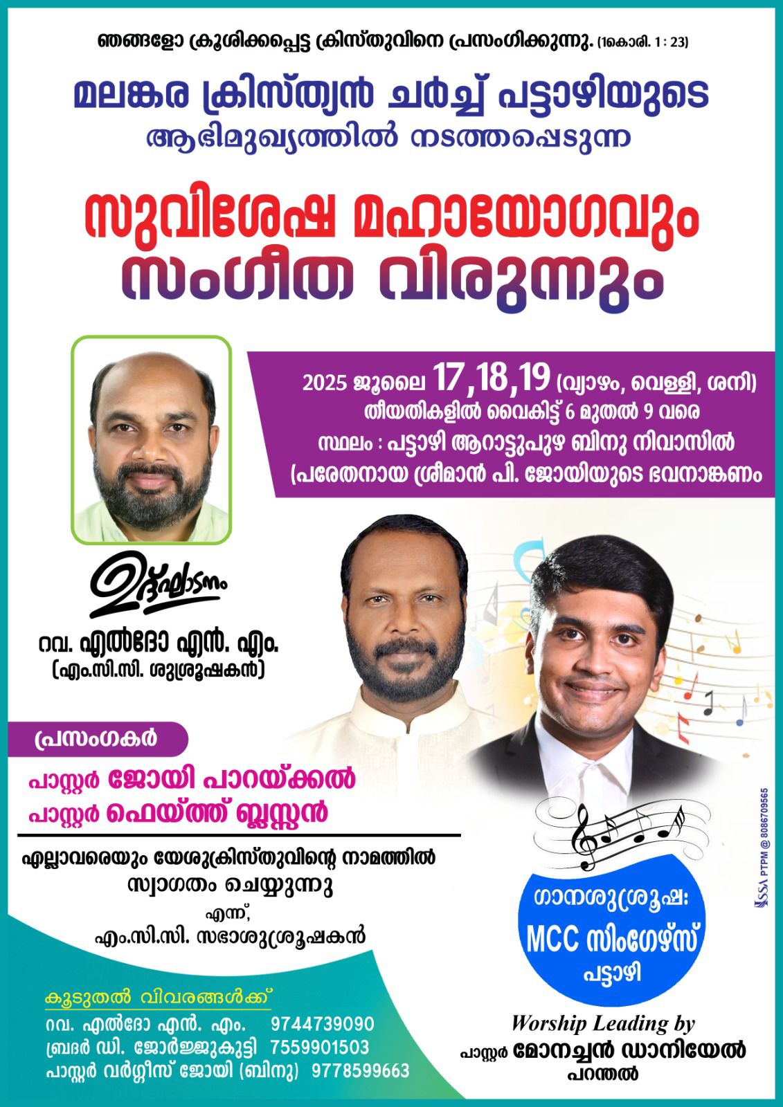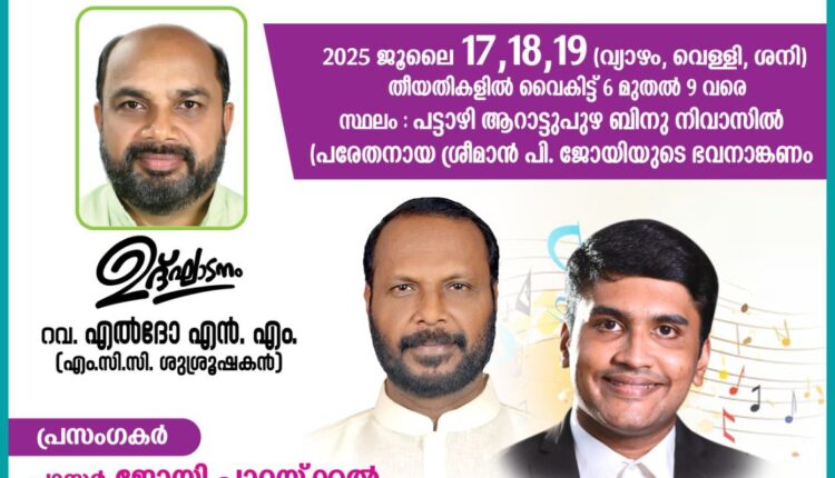 പട്ടാഴി മലങ്കര ക്രിസ്ത്യൻ ചർച്ചിന്റെ ആഭിമുഖ്യത്തിൽ സുവിശേഷ മഹായോഗവും സംഗീത വിരുന്നും ജൂലൈ 17 മുതൽ