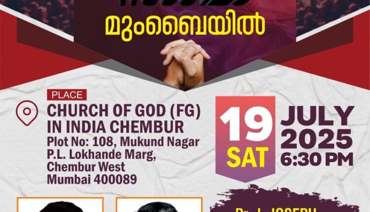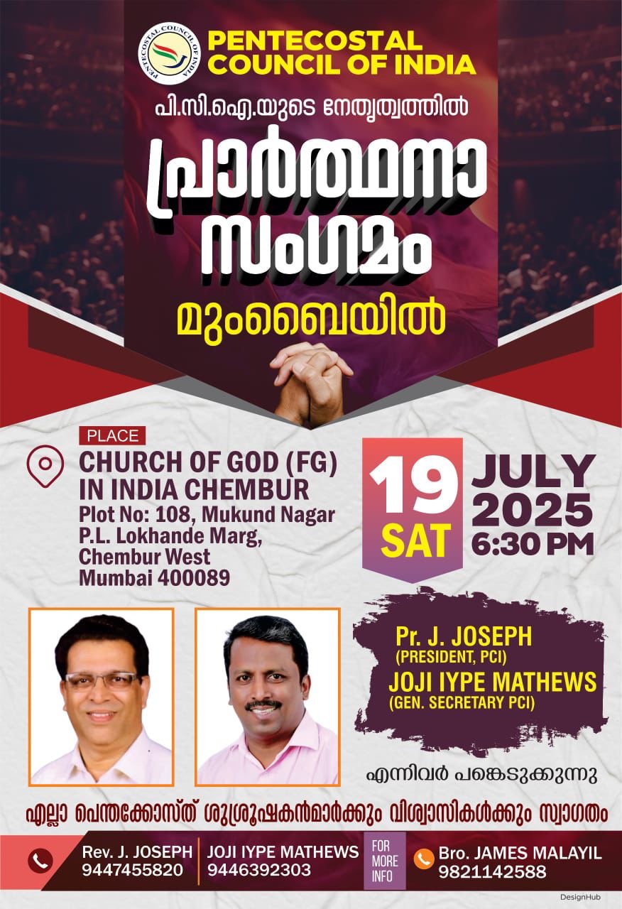 2025 ജൂലൈ 19 ശനിയാഴ്ച വൈകുന്നേരം 6.30ന് ചർച്ച് ഓഫ് ഗോഡ് ഇൻ ഇന്ത്യയുടെ ചെമ്പൂരിലുള്ള (മുംബൈ) ഹെഡ്ക്വട്ടേഴ്സിൽ നടക്കുന്ന പ്രാർത്ഥനാ സംഗമത്തിലേക്ക് സഭാവ്യത്യാസമെന്യേ ശുശ്രൂഷകന്മാരെയും ദൈവജനങ്ങളെയും കർത്തൃനാമത്തിൽ ക്ഷണിക്കുന്നു എന്ന് ഭാരവാഹികൾ അറിയിച്ചു. പി.സി.ഐ നാഷണൽ പ്രസിഡൻ്റ് പാസ്റ്റർ ജെ.ജോസഫും ജനറൽസെക്രട്ടറി ജോജി ഐപ്പ് മാത്യൂസും പങ്കെടുക്കുന്നു.