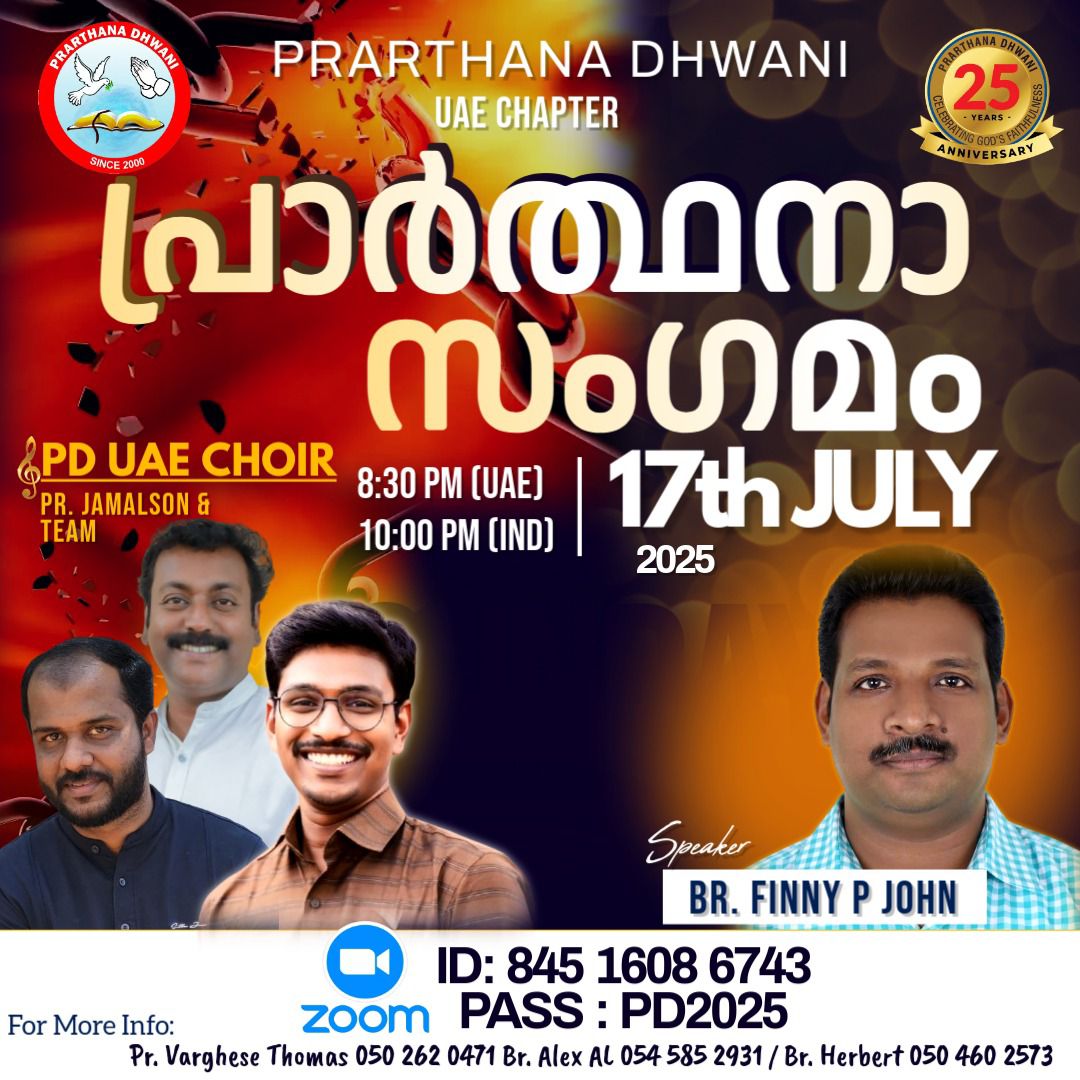 പാസ്റ്റർ ജെമൽസൺ ആലപ്പുഴയും, പ്രാർത്ഥനാ ധ്വനി ക്വയറും ഗാനങ്ങൾ ആലപിക്കുന്നതും, പ്രാർത്ഥനാ ധ്വനി യു എ ഇ മിഷൻ കോർഡിനേറ്റർ ബ്രദർ ഫിന്നി. പി ജോൺ ദൈവ വചനം ശുശ്രൂഷിക്കുന്നതുമാണ്.