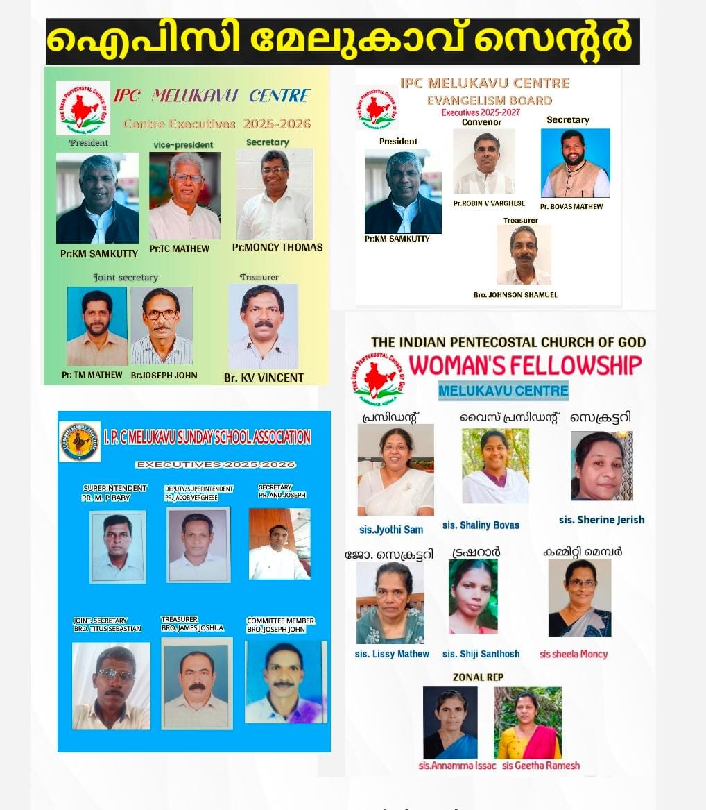 കോട്ടയം : കോട്ടയം ജില്ലയിലെ മലയോര പ്രദേശങ്ങളിൽ ഒന്നായ ഐ.പി.സി മേലുകാവ് സെന്ററിന് പുതിയ ഭാരവാഹികളെ തിരഞ്ഞെടുത്തു. ഐ.പി.സി മേലുകാവ് സെന്റർ മിനിസ്റ്റർ പാസ്റ്റർ കെ.എം സാംകുട്ടിയുടെ അധ്യക്ഷതയിൽ പാസ്റ്റർ കെ എം സാംകുട്ടി( സെന്റർ മിനിസ്റ്റർ), പാസ്റ്റർ റ്റി.സി മാത്യു( വൈസ് പ്രസിഡണ്ട് ), പാസ്റ്റർ മോൻസി തോമസ് ( സെക്രട്ടറി), ജോയിന്റ് സെക്രട്ടറിമാരായി പാസ്റ്റർ