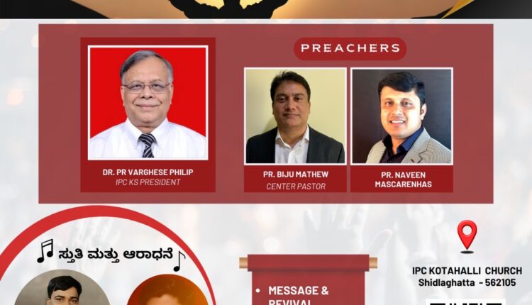ബെംഗളൂരു: ഐപിസി കർണാടക സ്റ്റേറ്റ് ദേവനഹള്ളി സെൻ്റർ കൺവെൻഷൻ ജൂലൈ 25 – 26 ന് ഷിഡ്ലഘട്ട ഐപിസി കോട്ടഹള്ളി സഭാഹാളിൽ നടക്കും.