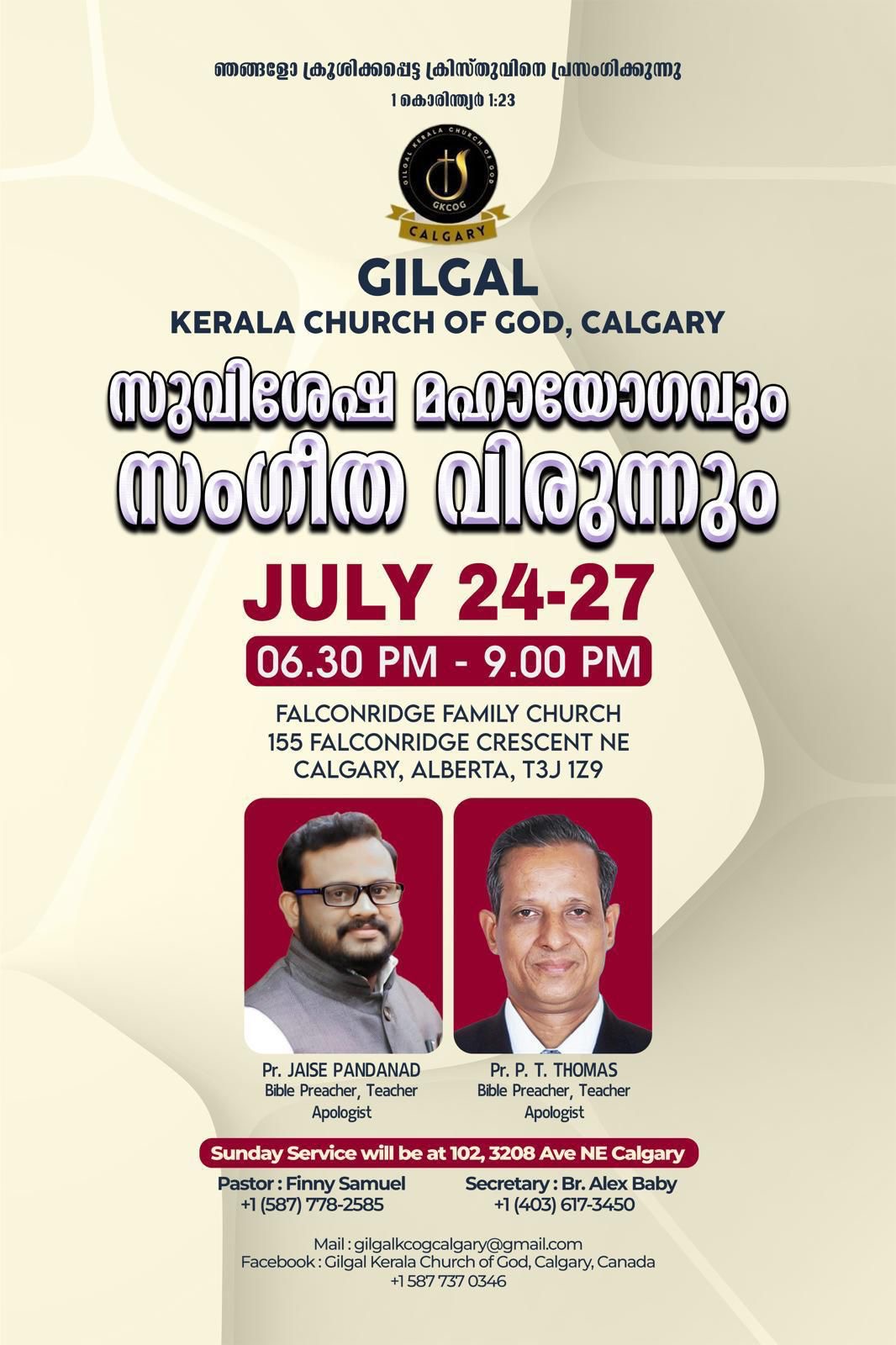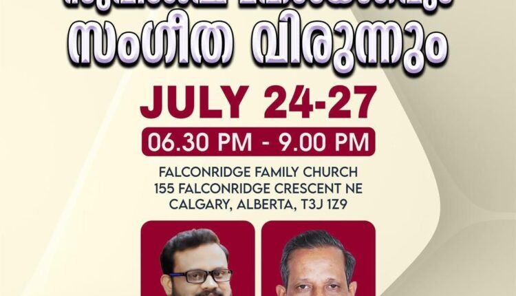 കാൽഗറി പട്ടണത്തിലുള്ള ഗിൽഗാൽ കേരള ചർച്ച് ഓഫ് ഗോഡിന്റെ ആഭിമുഖ്യത്തിൽ സുവിശേഷ മഹായോഗവും സംഗീത വിരുന്നും ജൂലൈ 24 മുതൽ 27 വരെ Falconridge Family Church ഇൽ വെച്ചു നടത്തപ്പെടുന്നു. എല്ലാ ദിവസവും വൈകുന്നേരം 6.30 മുതൽ 9.00 വരെ നടത്തെപ്പെടുന്ന ആത്മീയ കൂട്ടായ്മയിൽ പാസ്റ്റർ പി ടി തോമസ്, പാസ്റ്റർ ജെയ്സ് പാണ്ടനാട് എന്നിവർ ദൈവവചനം ശുശ്രുഷിക്കുന്നു. ഗിൽഗാൽ കേരള ചർച്ച് ഓഫ് ഗോഡ് ക്വയർ ഗാനശുശ്രുഷക്കു നേതൃത്വം നൽകുന്നു. കൂടുതൽ വിവരങ്ങൾക്കു +1587 737 0346 എന്ന നമ്പറിൽ ബന്ധപെടുക.