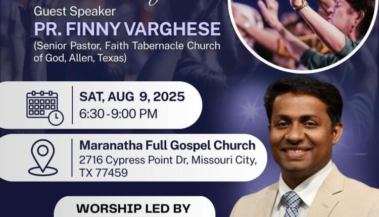 ഹ്യൂസ്റ്റണിലും അതിന്റെ സമീപ പ്രദേശങ്ങളിലുമായി ഉള്ള 16 പെന്തക്കോസ്തൽ സഭകൾ സംയുക്തമായി ഒരുക്കുന്ന ഈ ആത്മീയ സമ്മേളനം വിശ്വാസികളുടെ ഐക്യത്തിനും ആത്മീയ നവീകരണത്തിനും വേദിയാകുന്നതാണ്.