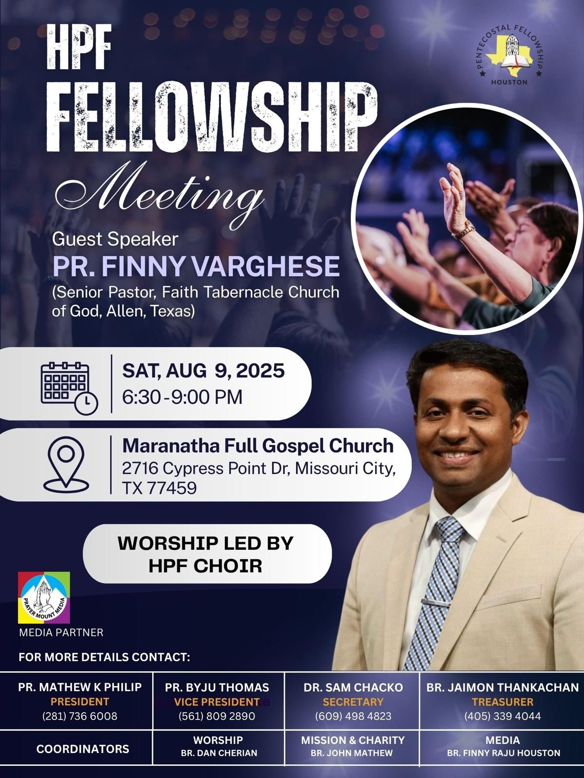 ഹ്യൂസ്റ്റൺ: ഹ്യൂസ്റ്റൺ പെന്തക്കോസ്ത് ഫെലോഷിപ്പിന്റെ ആഭിമുഖ്യത്തിൽ ആഗസ്റ്റ് 9, 2025 ശനിയാഴ്ച വൈകിട്ട് 6:30 മുതൽ 9:00 വരെ ഫെലോഷിപ്പ് മീറ്റിംഗ് നടത്തപ്പെടുന്നു. മീറ്റിംഗ് മിസൗറി സിറ്റിയിലെ Maranatha Full Gospel Church ൽ വെച്ച് നടത്തപ്പെടും. (വിലാസം: 2716 Cypress Point Dr, Missouri City, TX 77459)