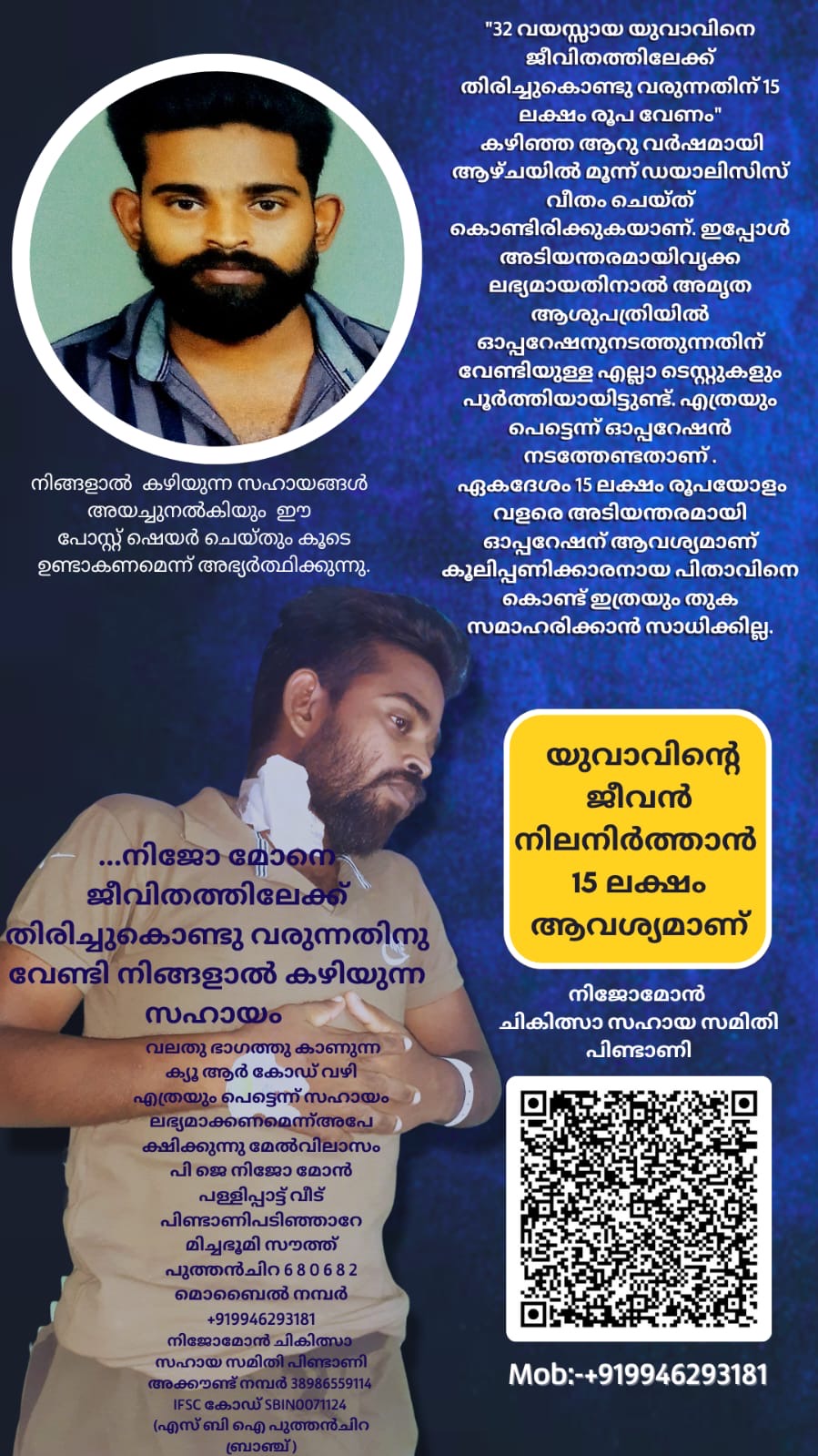മാള: തൃശ്ശൂർ ജില്ലയിൽ മുകുന്ദപുരം താലൂക്കിൽ പുത്തൻചിറ വില്ലേജിൽ പിണ്ടാണി ദേശത്ത് പടിഞ്ഞാറമിച്ച ഭൂമിയിൽ താമസിക്കുന്ന പള്ളിപ്പാട്ട് ജോൺസൺ മകൻ നിജോ മോൻ 32 വയസ്സ് ഇരു വൃക്കകളും തകരാറിലായത് മൂലം കഴിഞ്ഞ ആറു വർഷമായി ആഴ്ചയിൽ മൂന്ന് ഡയാലിസിസ് വീതം ചെയ്ത് കൊണ്ടിരിക്കുകയാണ് ഇപ്പോൾ അടിയന്തരമായിവൃക്ക ലഭ്യമായതിനാൽ അമൃത ആശുപത്രിയിൽ ഓപ്പറേഷനുനടത്തുന്നതിന് വേണ്ടിയുള്ള എല്ലാ ടെസ്റ്റുകളും പൂർത്തിയായിട്ടുണ്ട്. എത്രയും പെട്ടെന്ന് ഓപ്പറേഷൻ നടത്തേണ്ടതാണ് .