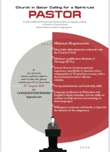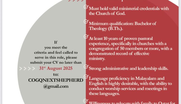 ആവശ്യമായ യോഗ്യതകൾ: ചർച്ച് ഓഫ് ഗോഡ് സഭകളിൽ ശുശ്രൂഷ പരിചയം ഉണ്ടായിരിക്കണം, കുറഞ്ഞത് ദൈവശാസ്ത്രത്തിൽ ബിരുദം (B.Th.)ഉണ്ടായിരിക്കണം, കുറഞ്ഞത് 10 വർഷത്തെ ശുശ്രൂഷ പരിചയം, ശക്തമായ ഭരണ, നേതൃത്വ കഴിവുകൾ, മലയാളത്തിലും ഇംഗ്ലീഷിലും ഭാഷാ പ്രാവീണ്യം ആവശ്യമാണ്. ഈ ഭാഷകളിൽ ആരാധനാ ശുശ്രൂഷകളും മീറ്റിംഗുകളും നടത്താനുള്ള കഴിവുണ്ടായിരിക്കണം. തിരഞ്ഞെടുക്കുന്നവർ ശുശ്രൂഷ കാലയളവിൽ കുടുംബമായി ഖത്തറിൽ താമസിക്കുവാൻ തയ്യാറാണം. 2025 ഓഗസ്റ്റ് 31ന് മുൻപായി ഈ വിലാസത്തിലേക്ക് ബയോഡേറ്റ അയക്കേണ്ടതാണ് COGQNEXTSHEPHERD @gmail.com