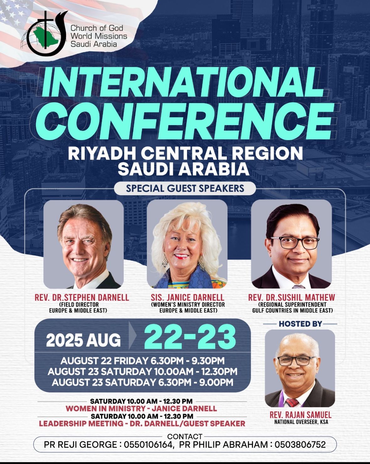 റിയാദ് : ചർച്ച് ഓഫ് ഗോഡ് വേൾഡ് മിഷൻസ് – സൗദി അറേബ്യ സെൻട്രൽ റീജിയണിന്റെ നേതൃത്വത്തിൽ 2025 ആഗസ്റ്റ് 22 മുതൽ 23 വരെ റിയാദിൽ അന്താരാഷ്ട്ര ക്രിസ്തീയ സമ്മേളനം നടക്കുന്നു. പ്രസിദ്ധരായ സുവിശേഷ പ്രസംഗകരുടെ നേതൃത്വം ഈ സമ്മേളനത്തിന് മാറ്റ് കൂട്ടുന്നു: