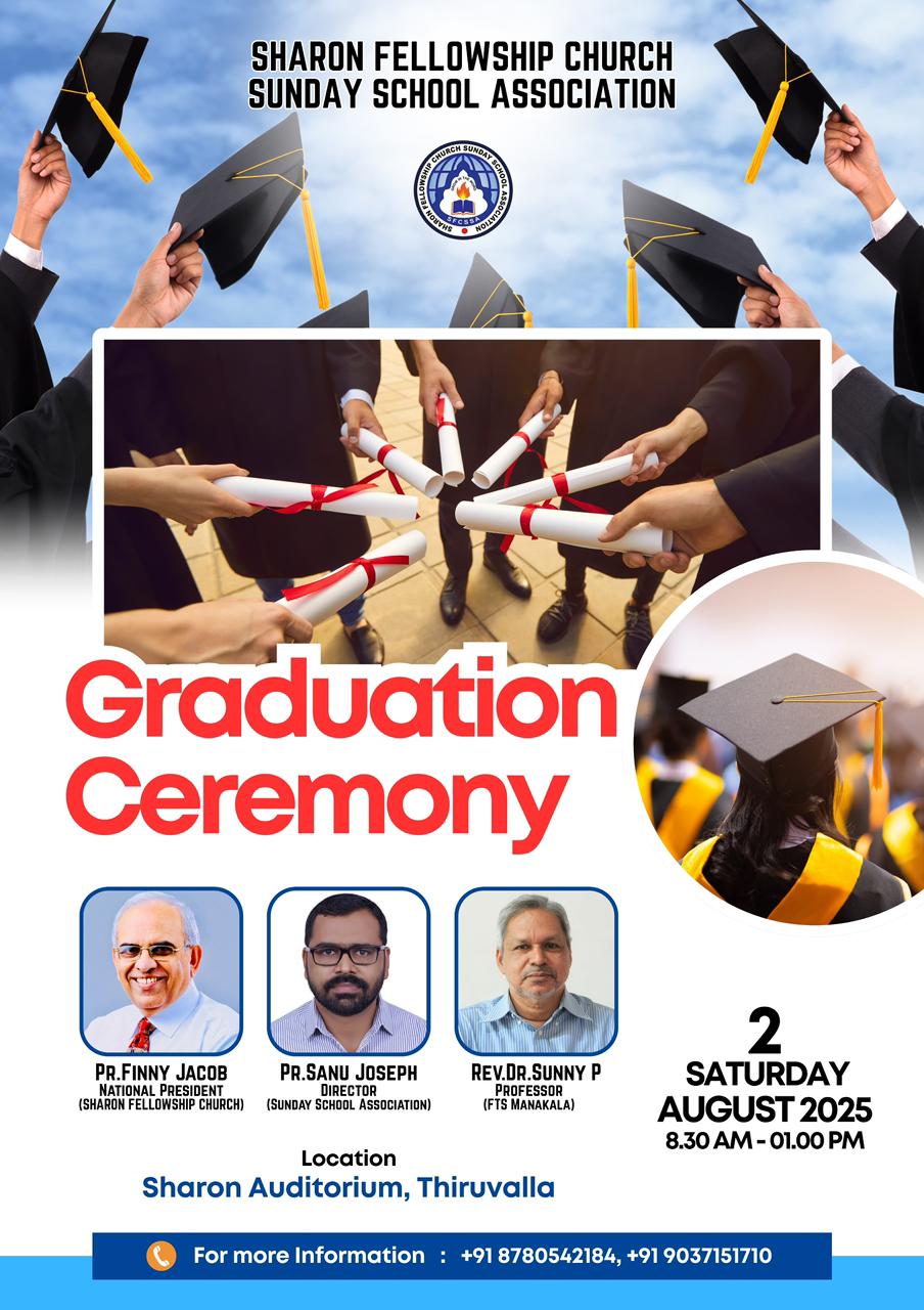 തിരുവല്ല : ശാരോൻ ഫെലോഷിപ്പ് സൺഡേസ്കൂൾ അസ്സോസിയേഷനിൽ 2025 അദ്ധ്യയന വർഷത്തിൽ 12 ക്ലാസ് പാസ്സായി പഠനം പൂർത്തീകരിച്ചവർക്കുള്ള ബിരുദ ദാനം *02-08-2025 ശനിയാഴ്ച രാവിലെ 8.30 മുതൽ തിരുവല്ല ശാരോൻ ആഡിറ്റോറിത്തിൽ* വച്ചുനടക്കും. സൺഡേസ്കൂൾ അസ്സോസ്സിയേഷൻ ഡയറക്ടർ പാസറ്റർ സനു ജോസഫ് അദ്ധ്യക്ഷത വഹിക്കുന്ന സമ്മേളനത്തിൽ *റവ. ഡോക്ടർ സണ്ണി P (FTS മണക്കാല) മുഖ്യാഥിതിയായിരിക്കും. സഭാ പ്രസിഡൻറ് റവ. ഫിന്നിജേക്കബ് ബിരുദ ദാനം നിർവഹിക്കും. പാസറ്റർ ഏബ്രഹാം ജോസഫ്, സന്ദേശം നല്കും.* പാസ്റ്റർമാരായ Pr. V J തോമസ്, ജോൺസൻ കെ ശാമുവേൽ, ജേക്കബ് ജോർജ്ജ്, സാംസൻ തോമസ്സ്, ടോണി തോമസ്, Br. T O പൊടിക്കുഞ്ഞ്, Br. രാജൻ ഈശോ, തുടങ്ങി സഭാ നേതൃത്ത്വത്തിലുള്ള പ്രമൂഖർ പങ്കെടുക്കും. പാസ്റ്റർ പി എ ചാക്കോച്ചൻ സ്വാഗതവും, സിസറ്റർ സോണിയ നന്ദിയും പ്രകാശിപ്പിക്കും. ബിരുദാർത്ഥികളെ പ്രതിനിധീകരിച്ച് സോനാ സുനു മറുപടി പ്രസംഗം നിർവഹിക്കും. രാവിലെ 8.30 ന് ആരംഭിക്കുന്ന സമ്മേളനം ഉച്ചയ്ക്ക് 1 മണിയോടെ അവസാനിക്കും.