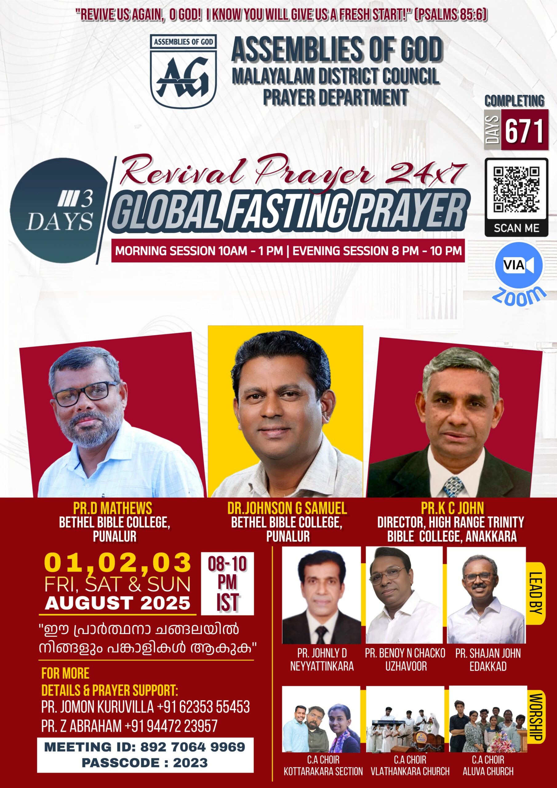 എല്ലായ്പ്പോഴും മീറ്റിംഗിൽ പ്രവേശിക്കാവുന്നതാണ്. പ്രാർത്ഥിക്കാനും പ്രാർത്ഥനാ വിഷയങ്ങൾ പങ്കുവയ്ക്കുവാനും ഏതു സമയത്തും മീറ്റിംഗിൽ ജോയിൻ ചെയ്യാം. കൂടുതൽ വിവരങ്ങൾക്ക്: പാസ്റ്റർ ജോമോൻ കുരുവിള 6235355453, പാസ്റ്റർ ഇസഡ്.ഏബ്രഹാം 9447223957 എന്നീ നമ്പരുകളിൽ ബന്ധപ്പെടാവുന്നതാണ്.