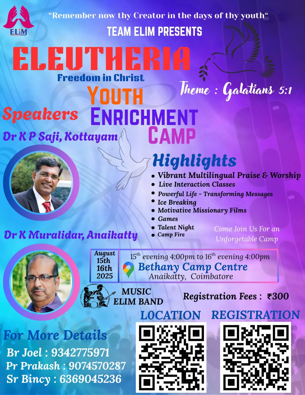 കോയമ്പത്തൂർ : ടീം എലീം ഒരുക്കുന്ന യുവജന ക്യാമ്പ് ‘എലൂത്രിയ‘ ഓഗസ്റ്റ് 15,16 തിയതികളിൽ ആനക്കട്ടി ബെഥനി (ടസ്ക്കർ) ക്യാമ്പ് സെന്ററിൽ നടക്കുന്നു. വെള്ളിയാഴ്ച്ച വൈകിട്ട് 4 മണിക്ക് ആരംഭിച്ച് ശനിയാഴ്ച്ച വൈകിട്ട് 4 മണിക്ക് അവസാനിക്കുന്ന ഈ ക്യാമ്പിൽ ഡോ. കെ. മുരളീധർ, ഡോ. കെ. പി. സജി എന്നീ ദൈവ ദാസന്മാർ ശുശ്രൂഷിക്കുന്നു. എലീം ബാൻഡ് ഗാനങ്ങൾ ആലപിക്കുന്നു. ബ്രദർ ജോയൽ, പാസ്റ്റർ പ്രകാശ്, സിസ്റ്റർ ബിൻസി എന്നിവർ നേതൃത്വം നൽകുന്നു.