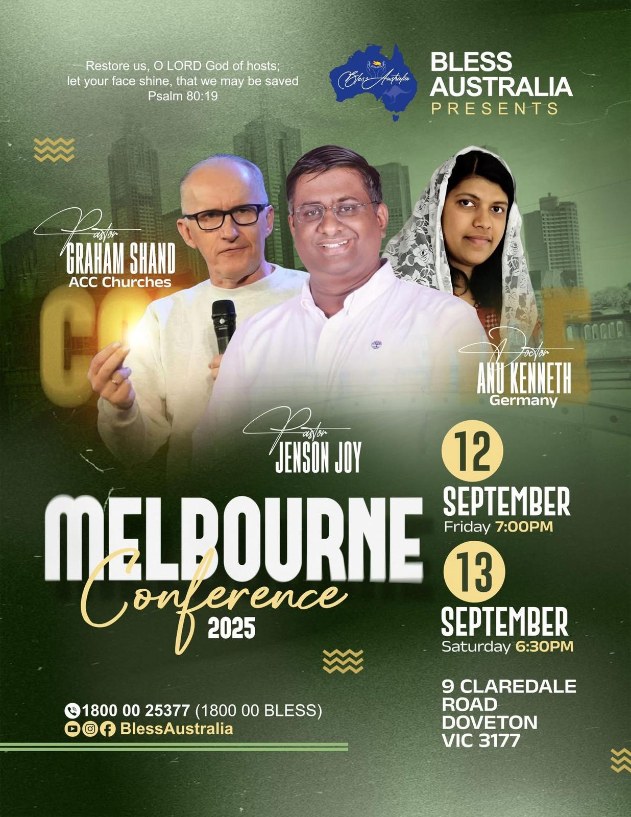 Melbourne, Australia: It’s time to come together as one body to pray for our city! Join us for the Bless Australia Conference 2025, a gathering of believers from across Melbourne, united in purpose – crying out for revival, interceding for the next generation, seeking the face of God like never before. We will have an anointed time of Worship and a powerful Word.