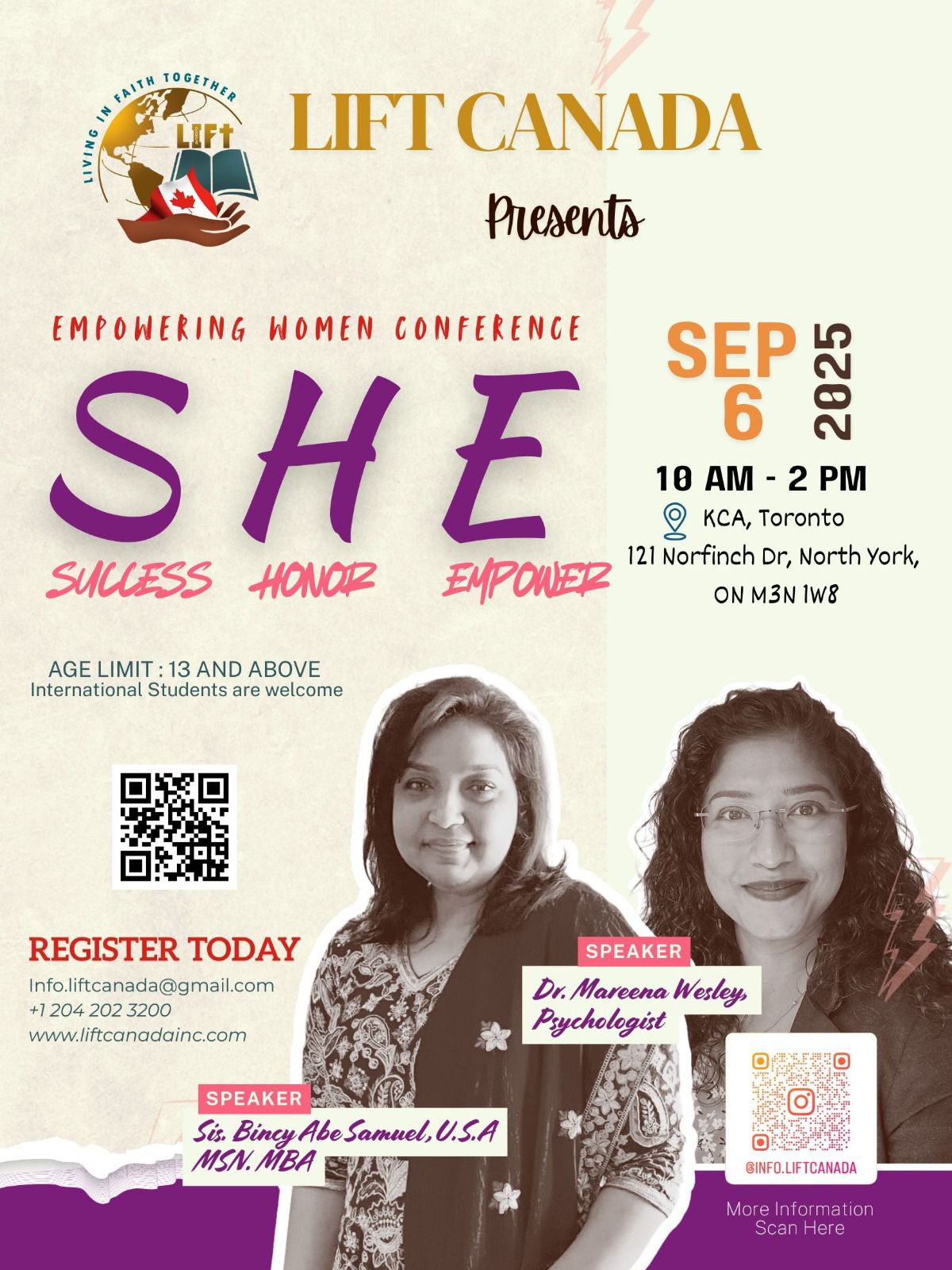 ടോറോന്റോ : LIFT Canada ഒരുക്കുന്ന വുമൺ എംപവറിങ് കോൺഫറൻസ് SHE 2025 (Success, Holy, Empower) ടോറോന്റോ കേരള ക്രിസ്ത്യൻ അസംബ്ലിയിൽ (KCA Church Toronto) വച്ച് September 6, 2025 ശനിയാഴ്ച രാവിലെ 10 മുതൽ 2 മണിവരെ നടത്തപ്പെടുന്നു .ഈ കോൺഫെറെൻസിൽ പ്രശസ്ത സൈക്കോളജിസ്റ്റ് ഡോക്ടർ. മറീന വെസ്ലി , സിസ്റ്റർ. ബിൻസി സാമുവൽ, ഫിലാഡൽഫിയ എന്നിവർ മുഖ്യാതിഥികളായിരിക്കും . വൈകാരിക ക്ഷേമവും മാനസീക ആരോഗ്യവും ആത്മീക വളർച്ചയും എന്നീ വിഷയങ്ങളെ ആസ്പദമാക്കി സംസാരിക്കും. പ്രായപരിധി 13 വയസ്സിന് മുകളിൽ . രജിസ്ട്രേഷൻ സൗജന്യമായിരിക്കും . ഒന്റാരിയോയിലെ വിവിധ സഭകളിൽ നിന്നും സഹോദരിമാർ ഈ കോൺഫെറെൻസിൽ പങ്കെടുക്കും. ഈ കോൺഫെറെൻസിൽ രജിസ്റ്റർ ചെയ്യുന്നതിന് വേണ്ടി QR CODE scan ചെയ്യുകയോ info.liftcanada@gmail.com ഇൽ ബന്ധപ്പെടുകയോ ചെയ്യാവുന്നതാണ് .
