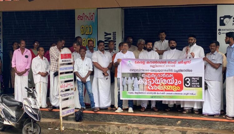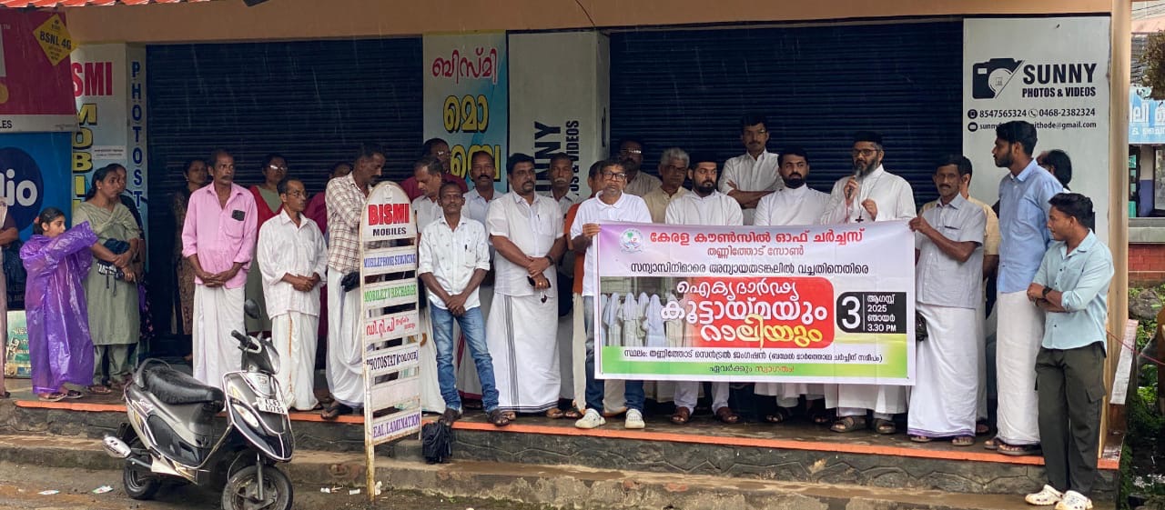 തണ്ണിത്തോട്: നിരപരാധികളായ കന്യസ്ത്രികളെ ജയിലിൽ അടച്ച് കള്ള കേസിൽ കുടുക്കിയ വിഷയത്തിൽ ഐക്യദാർഡ്യം പ്രഖ്യാപിച്ച് കേരള കൗൺസിൽ ഓഫ് ചർച്ചസ് തണ്ണിത്തോട് സോൺ പ്രതിഷേധ മിറ്റിംഗ് സംഘടിപ്പിച്ചു. സോൺ വൈസ് പ്രസിഡൻ്റ് റവ അൻ്റോ അച്ചൻകുഞ്ഞ് അദ്ധ്യക്ഷവഹിച്ച മീറ്റിംഗ്. സോൺ പ്രസിഡൻ്റ് ഫാദർ ഒ എം ശമുവേൽ ഉദ്ഘാടനം ചെയ്തു. മീറ്റിംഗിൽ ഫാദർ ജിബിൻ ജെയിംസ് തണ്ണിത്തോട് ഗ്രാമപഞ്ചായത്ത് പ്രസിഡൻ്റ് ഷാജി കെ സാമുവേൽ, അനീഷ് തോമസ്, ജോയിക്കുട്ടി ചേടിയത്ത്, എൽ എം മത്തായി, കെ വി സമുവേൽ, റൂബി സ്കറിയ, പ്രിൻസി ഗോസ്, ജോൺ അയിനവിളയിൽ, ജോൺ കിഴക്കേതിൽ, ബ്ലെസൻ മാത്യു,മോനിഷ് മുട്ടുമണ്ണിൽ എന്നിവർ പ്രസംഗിച്ചു.