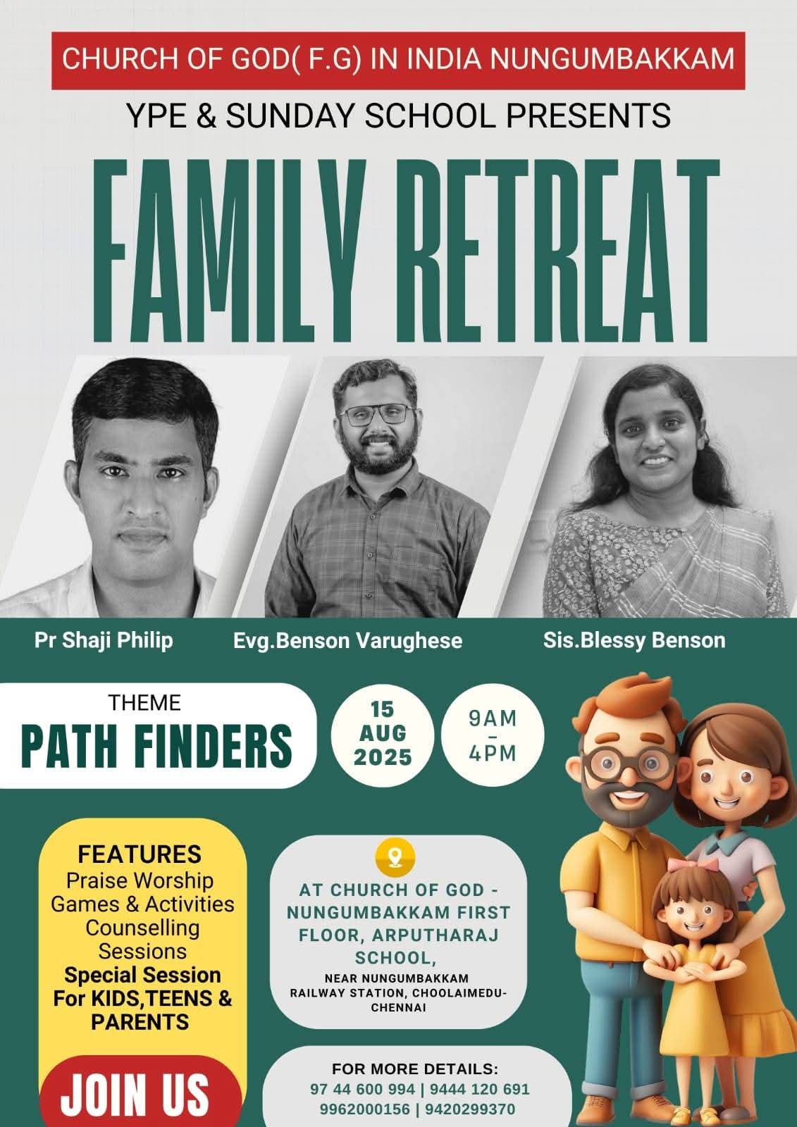 ചെന്നൈ : ചർച്ച് ഓഫ് ഗോഡ്, നുങ്കംബാക്കം, ചെന്നൈ വൈ പി ഇ, സൺഡേ സ്കൂളിന്റെയും ആഭിമുഖ്യത്തിൽ കുട്ടികൾക്കും മുതിർന്നവർക്കും ആയി ഒരു ഏകദിന ക്യാമ്പ് 2025 ആഗസ്റ്റ് മാസം പതിനഞ്ചാം തീയതി രാവിലെ 9 മണി മുതൽ 4 മണി വരെ ചൂളൈമേട് അർപ്പുതരാജ് മെട്രിക്കുലേഷൻ സ്കൂളിൽ വച്ച് ക്രമീകരിച്ചിരിക്കുന്നു. പ്രസ്തുത ക്യാമ്പിൽ പാസ്റ്റർ. ഷാജി ഫിലിപ്പ് ( സി ജി ഐ കേരള സ്റ്റേറ്റ് കൗൺസിലിംഗ് ഡിപ്പാർട്ട്മെന്റ്), ഇവാ. ബെൻസൺ വർഗീസ് & ബ്ലെസ്സി ബെൻസൺ ( എക്സൽ മിനിസ്ട്രിസ് ) എന്നിവർ ക്ലാസുകൾ നയിക്കുന്നു. ആയതിലേക്ക് പ്രായഭേദമന്യേ എല്ലാവരെയും സ്വാഗതം ചെയ്യുന്നു.