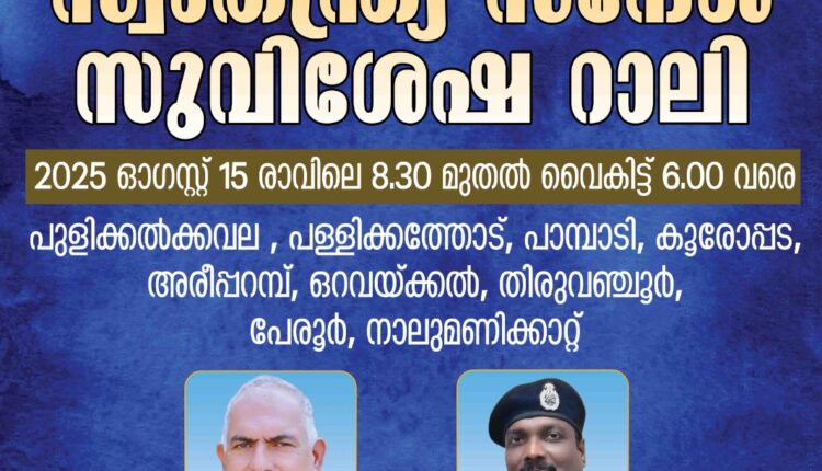 പാമ്പാടി : ഐപിസി പാമ്പാടി സെന്റർപുത്രിക സംഘടനകളുടെയും, വിവിധ ബോർഡുകളുടെയും നേതൃത്വത്തിൽ ലഹരി വിരുദ്ധ സ്വാതന്ത്ര്യ സന്ദേശ സുവിശേഷ റാലി 2025 ഓഗസ്റ്റ് 15ന് രാവിലെ 8:30 മുതൽ നടത്തുന്നു. ഐ.പി.സി പാമ്പാടി സെൻ്റർ മിനിസ്റ്റർ പാസ്റ്റർ സാം ഡാനിയേൽ ഉത്ഘാടനം നിർവഹിക്കുന്നതും, കാഞ്ഞിരപ്പള്ളി