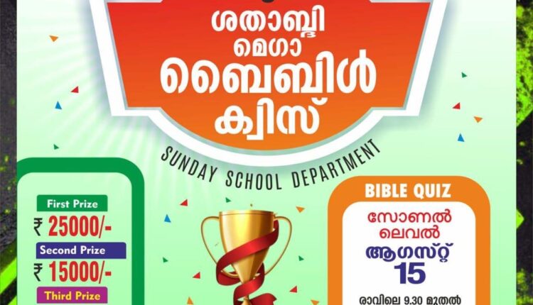 മുളക്കുഴ: ചർച്ച് ഓഫ് ഗോഡ് കേരള സ്റ്റേറ്റ് സൺഡേസ്കൂൾ ഡിപ്പാർട്ട്മെന്റിന്റെ ശതാബ്ദി ആഘോഷങ്ങളുടെ ഭാഗമായി സംഘടിപ്പിക്കുന്ന മെഗാ ബൈബിൾ ക്വിസ്സിന്റെ രണ്ടാം ഘട്ടം മേഖലാ തലത്തിൽ കേരളത്തിലെ 9 സോണുകളിലായി ഓഗസ്റ്റ് 15ന് രാവിലെ 10 മണിക്ക് നടക്കും.