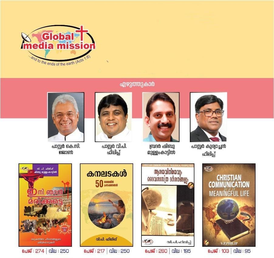 “ദൈവ മനുഷ്യന്റെ വിജയ രഹസ്യങ്ങൾ” നാലു പതിപ്പ് പുറത്തിറങ്ങി. “അണയാത്ത അഗ്നിജ്വാല” യുടെ പരിഷ്കരിച്ച മൂന്നാം പതിപ്പ് തയ്യാറാകുന്നു. ഗ്ലോബൽ മീഡിയ മിഷന്റെ ഏറ്റവും പുതിയ പുസ്തകം പാസ്റ്റർ കെ സി ജോണും വി പി ഫിലിപ്പും ഒരുമിച്ചെഴുതിയ ‘പുതിയ നിയമത്തിന്റെ ശുശ്രൂഷകർ’ എന്ന സുവിശേഷവേലക്കാർക്കും പാസ്റ്റഴ്സിനും പ്രയോജനപ്പെടുന്ന പുസ്തകമാണ്. ഒരു ഡസൻ പുസ്തകങ്ങൾ മീഡിയ മിഷൻ പ്രസിദ്ധീകരിച്ചിട്ടുണ്ട്. അതോടൊപ്പം മൾട്ടി കളർ ട്രാക്റ്റും സിഡിയും. മധ്യമ സുവിശേഷീകരണത്തിലും പുസ്തക പ്രസാധനത്തിലും ഗ്ലോബൽ മീഡിയ മിഷൻ പുതിയ ചുവടുകൾ വയ്ക്കുകയാണ്. glomalmediamission.com എന്ന വെബ്സൈറ്റ് ഉടൻ ലോഞ്ചാകും. പാസ്റ്റർ വി പി ഫിലിപ്പിനോടുകൂടെ ഒരു എഡിറ്റോറിയൽ ബോർഡും പ്രവർത്തിക്കുന്നു.