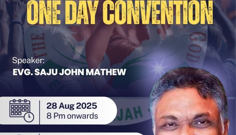 ഷാർജ: ഐ പി സി എലീം, ഷാർജ, റാസൽഖൈമ സഭകളുടെ ആഭിമുഖ്യത്തിൽ ഷാർജ സാസ് ഇവന്റ് മാനേജ്മെന്റ് ഹാളിൽ ഓഗസ്റ്റ് 28 നാളെ വൈകിട്ട് 8 മണി മുതൽ ഏകദിന കൺവൻഷൻ നടത്തപ്പെടുന്നു. ഇവാ. സാജു ജോൺ മാത്യു ദൈവ വചന പ്രഘോഷണം നിർവ്വഹിക്കും. പാ. ഷൈനോജ് നൈനാൻ ശുശ്രൂഷകൾക്ക് നേത്യത്വം നൽകും.